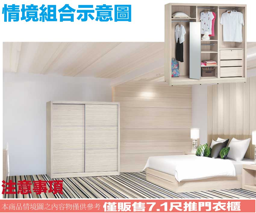 【綠家居】包格斯7.1尺推門衣櫃(內含穿衣鏡面) 白梣木紋色系+安心材質製造,使用放心+搭配居家更便利,採用防蛀木心板+防潮耐磨底座+五金滑軌結構+強化玻璃鏡面等安心材質製造 ,外層採用防潮耐磨噴漆處理搭配採用推門櫃+吊衣桿+三抽屜+內開放層格+內含側拉穿衣鏡面等收納空間設計,全由專人配送到家,專業安心服務,替你省下更多時間!