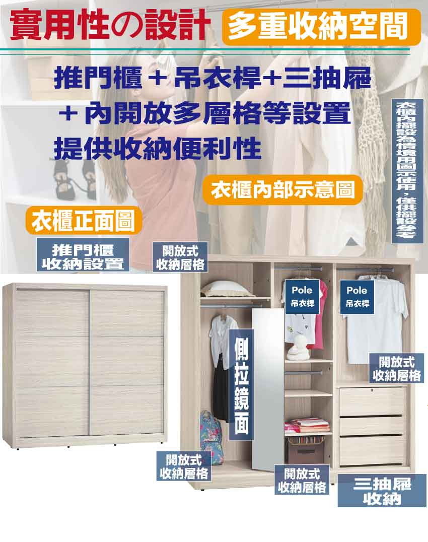 搭配採用推門櫃+吊衣桿+三抽屜+內開放層格等收納空間設計