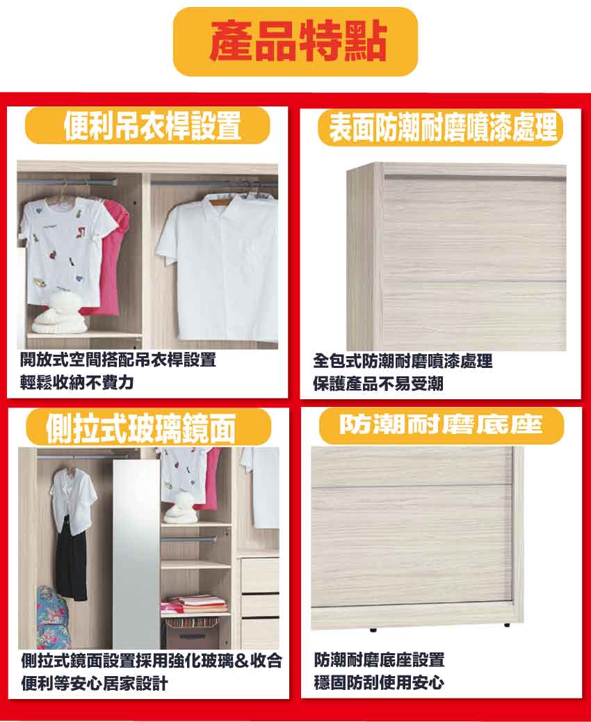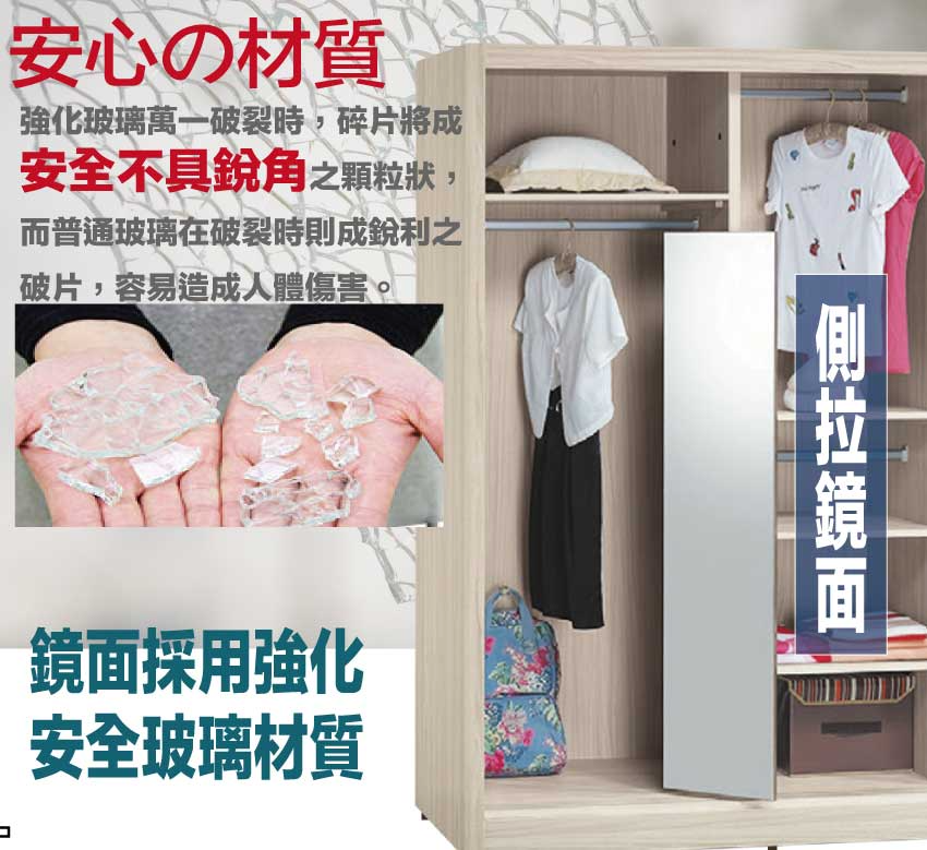 採用防蛀木心板+防潮耐磨底座+五金滑軌結構+強化玻璃鏡面內+含側拉穿衣鏡面等安心材質製造