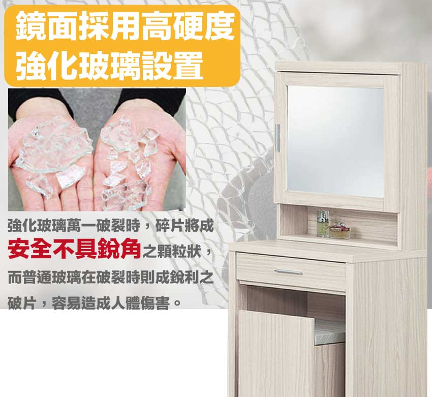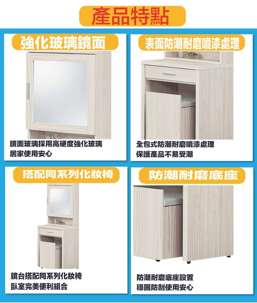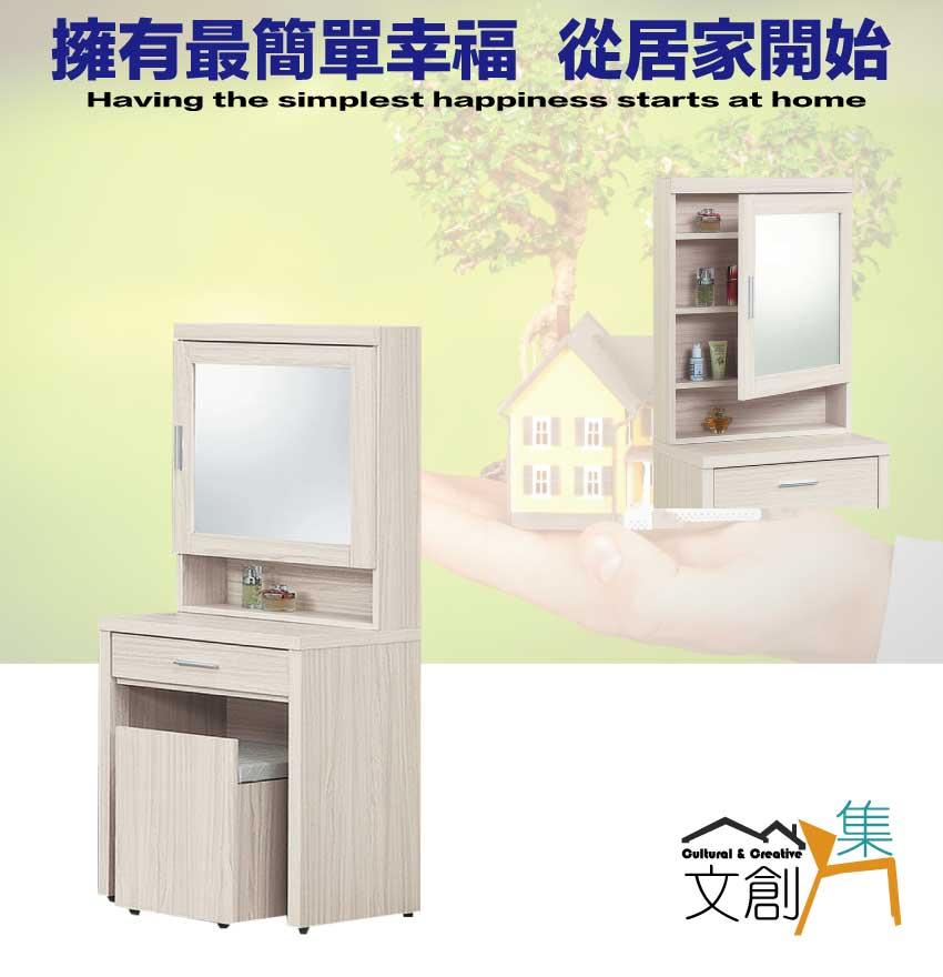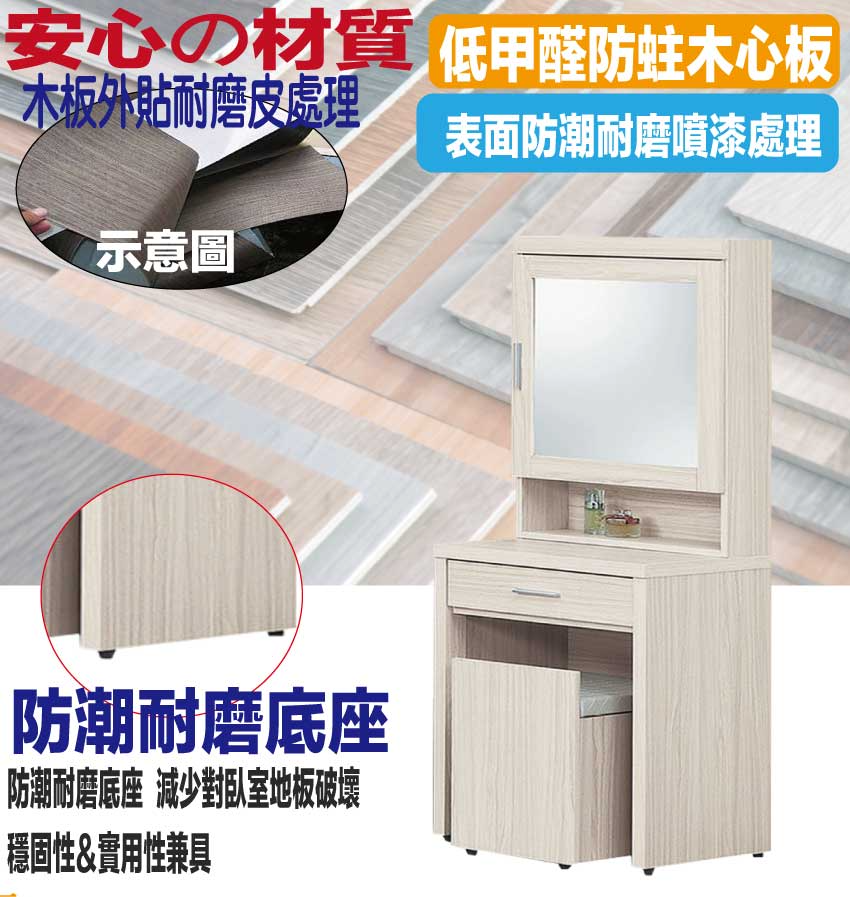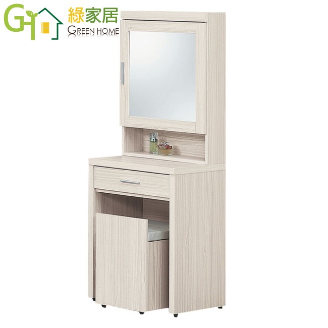 【綠家居】包格斯2尺開合鏡面鏡台組合(含化妝椅) 白梣木紋色系+安心材質製造,使用放心+搭配居家更便利,採用防蛀木心板+防潮耐磨底座+強化玻璃鏡面等安心材質製造 ,外層採用防潮耐磨噴漆處理搭配採用開合鏡面櫃+單抽屜+內&外開放層格等收納空間設計,全由專人配送到家,專業安心服務,替你省下更多時間!
