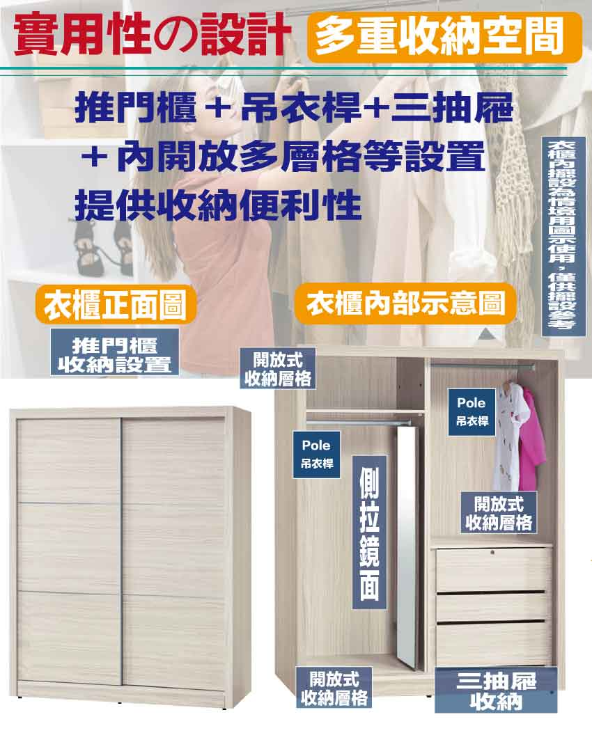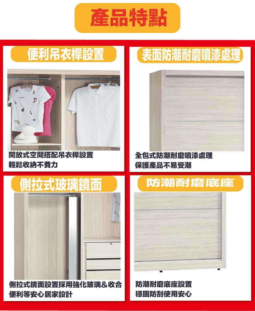採用防蛀木心板+防潮耐磨底座+五金滑軌結構+強化玻璃鏡面內+含側拉穿衣鏡面等安心材質製造