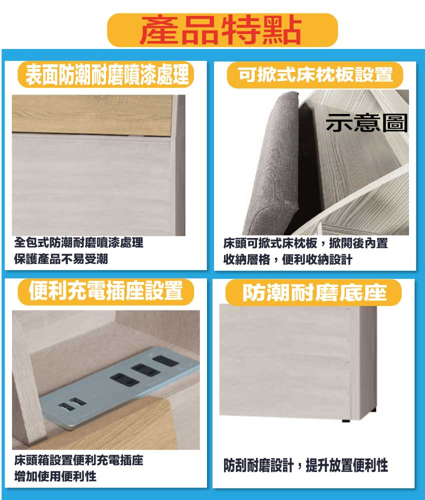 搭配床頭採用可掀式床枕板+內&外收納空間+USB便利插座等收納空間設計