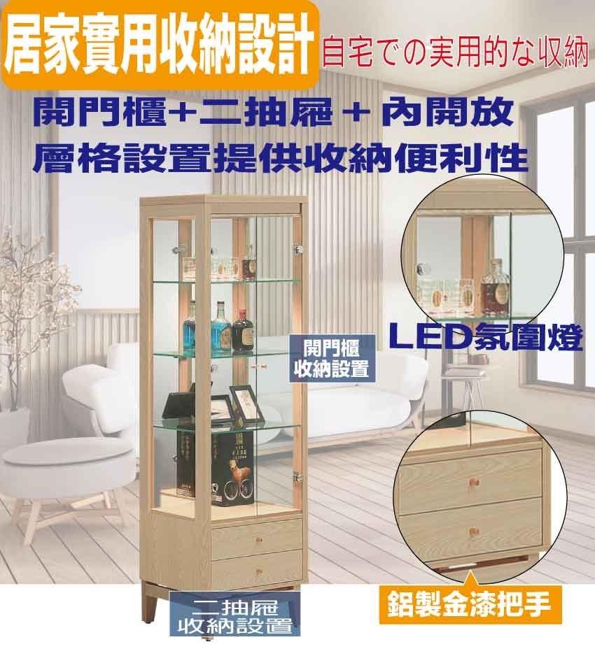 搭配採用開門櫃+二抽屜+內開放式層格+LED展示燈等收納空間設計