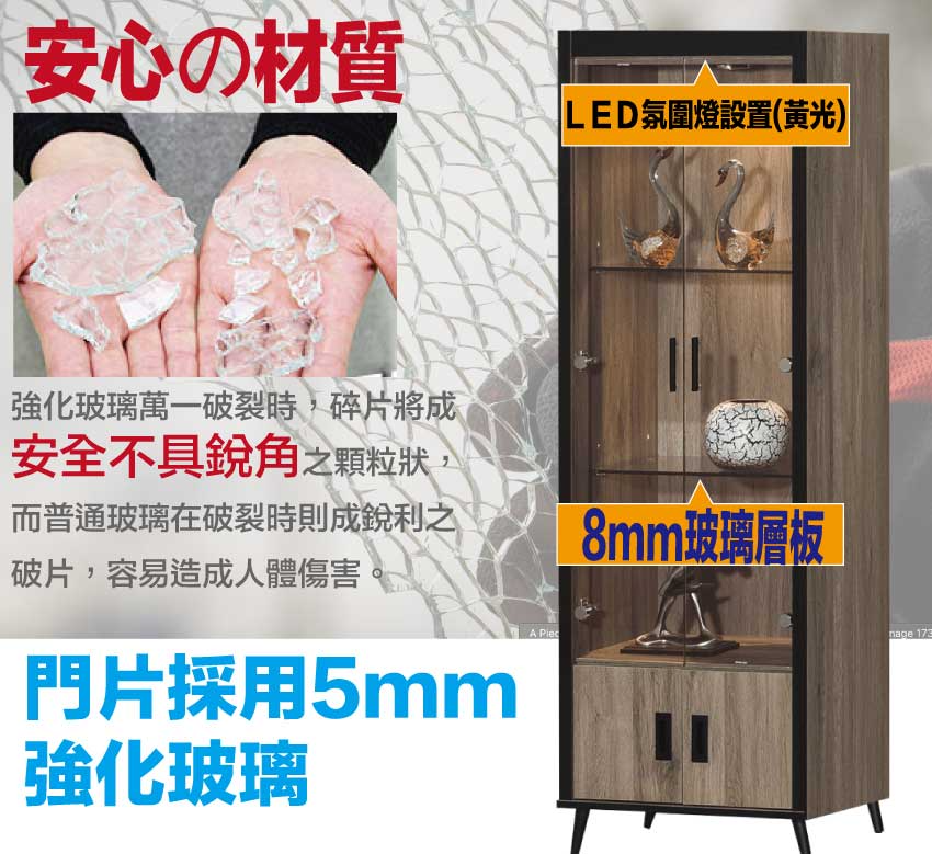 採用防蛀木心板+烤漆五金腳座+強化玻璃門片等安心材質製造