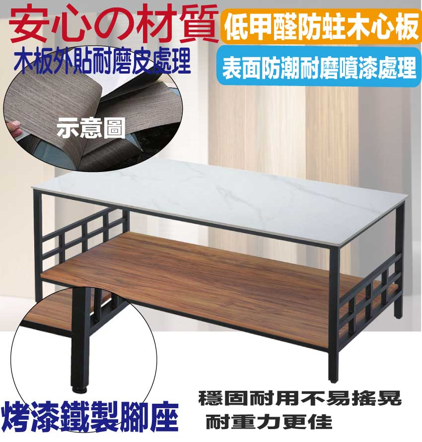 材質:防蛀木心板+烤漆五金腳座+12mm高硬度岩板桌面板