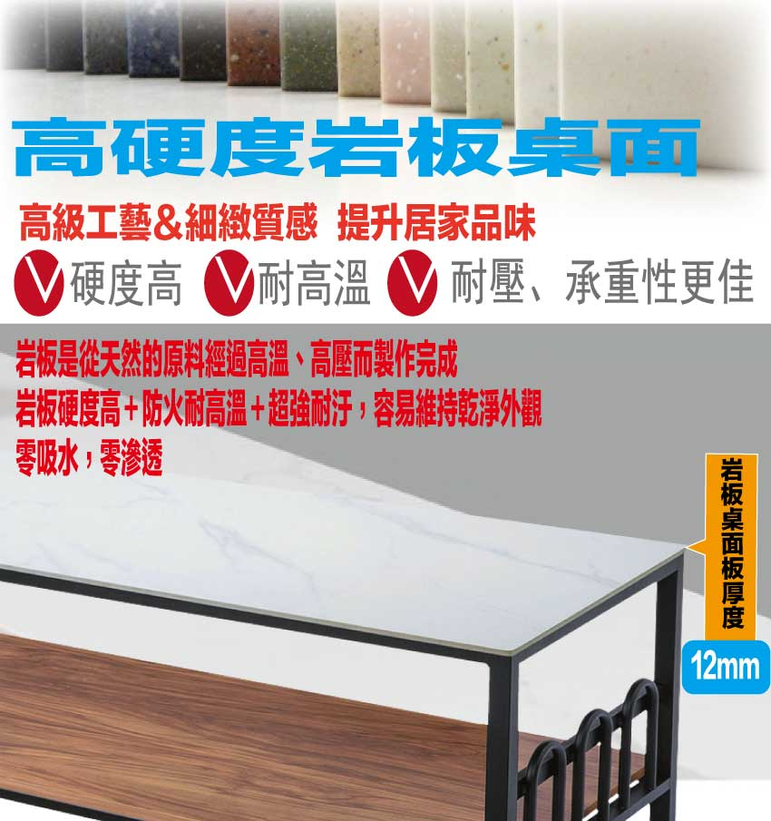 採用防蛀木心板+五金鐵框腳座+12mm高硬度岩板桌面板等安心材質製造