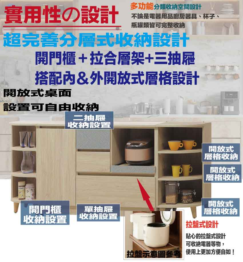 採用開門櫃+拉盤層架+三抽屜+開放層格等收納空間設計