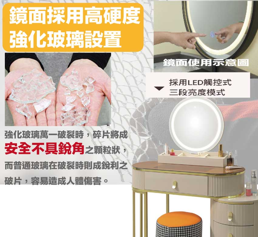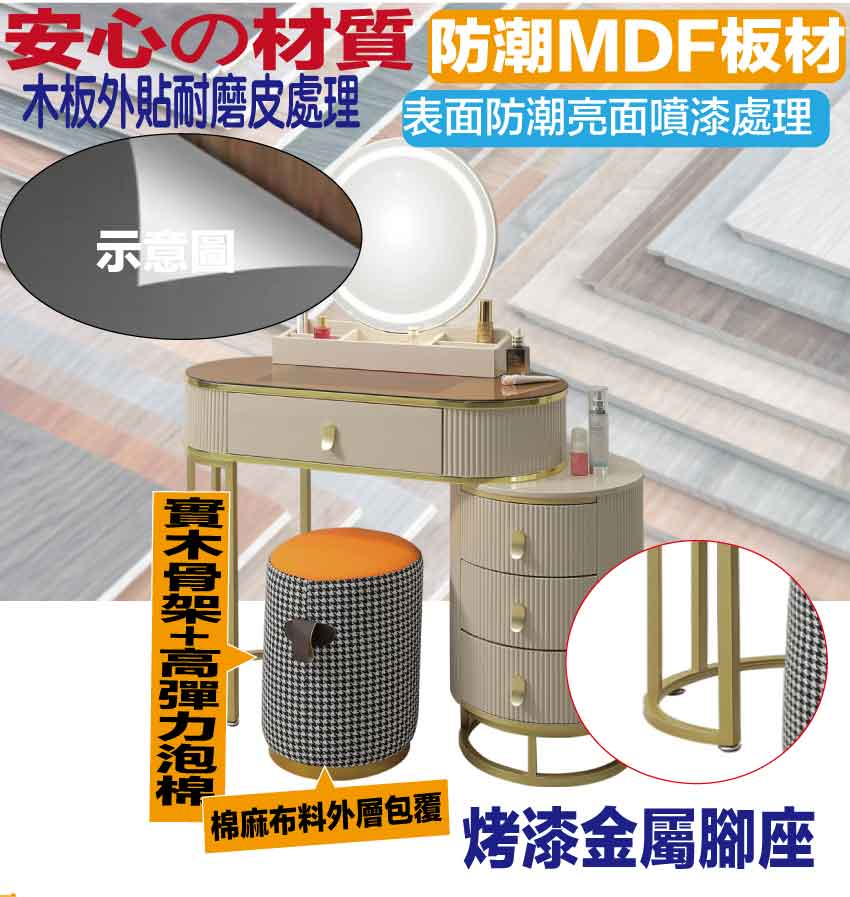 採用防潮MDF板+烤漆金屬腳座+強化玻璃鏡面+透氣棉麻布料+高回彈泡棉等安心材質製造