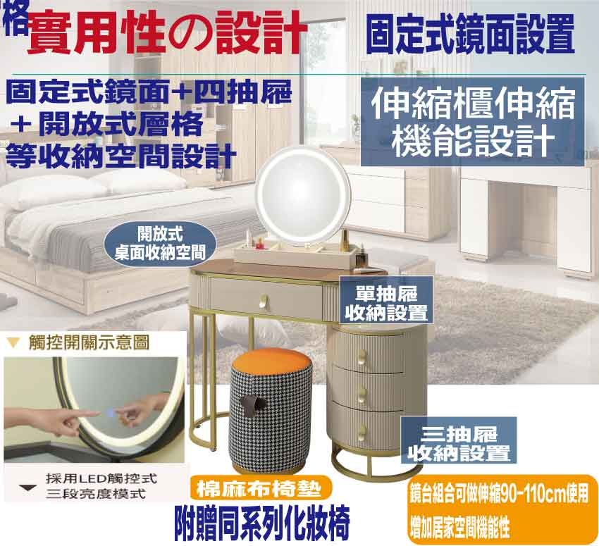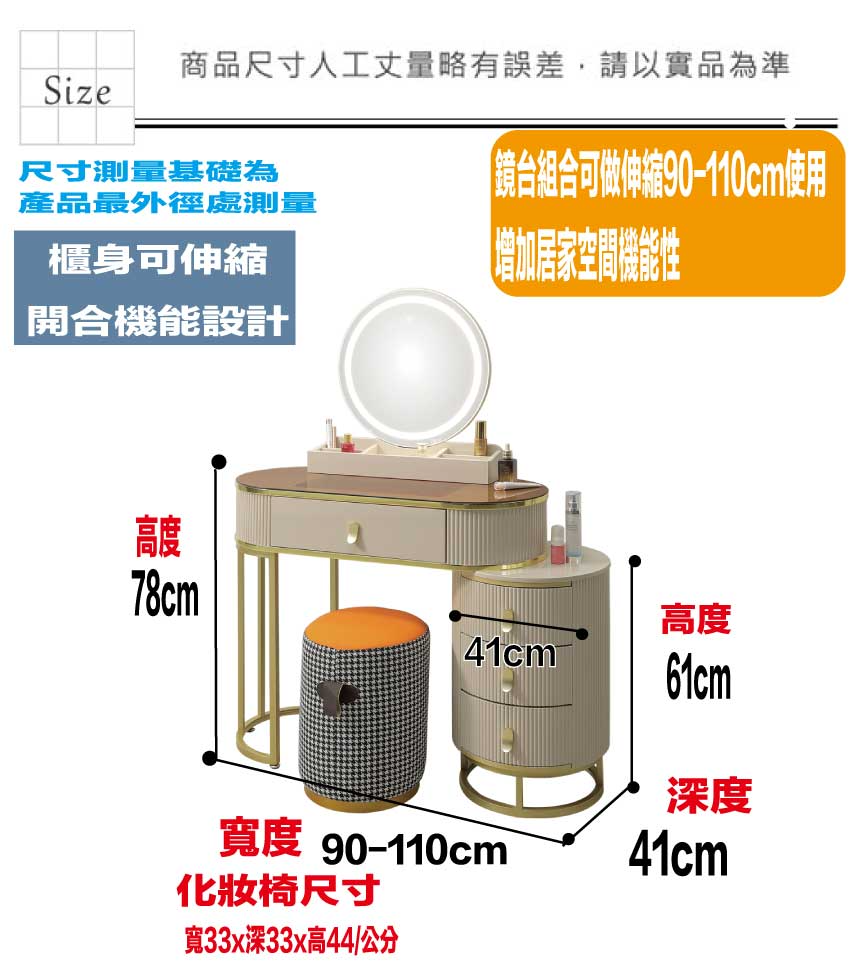 此鏡台組合可伸縮寬度90-110cm變化增加空間靈活性