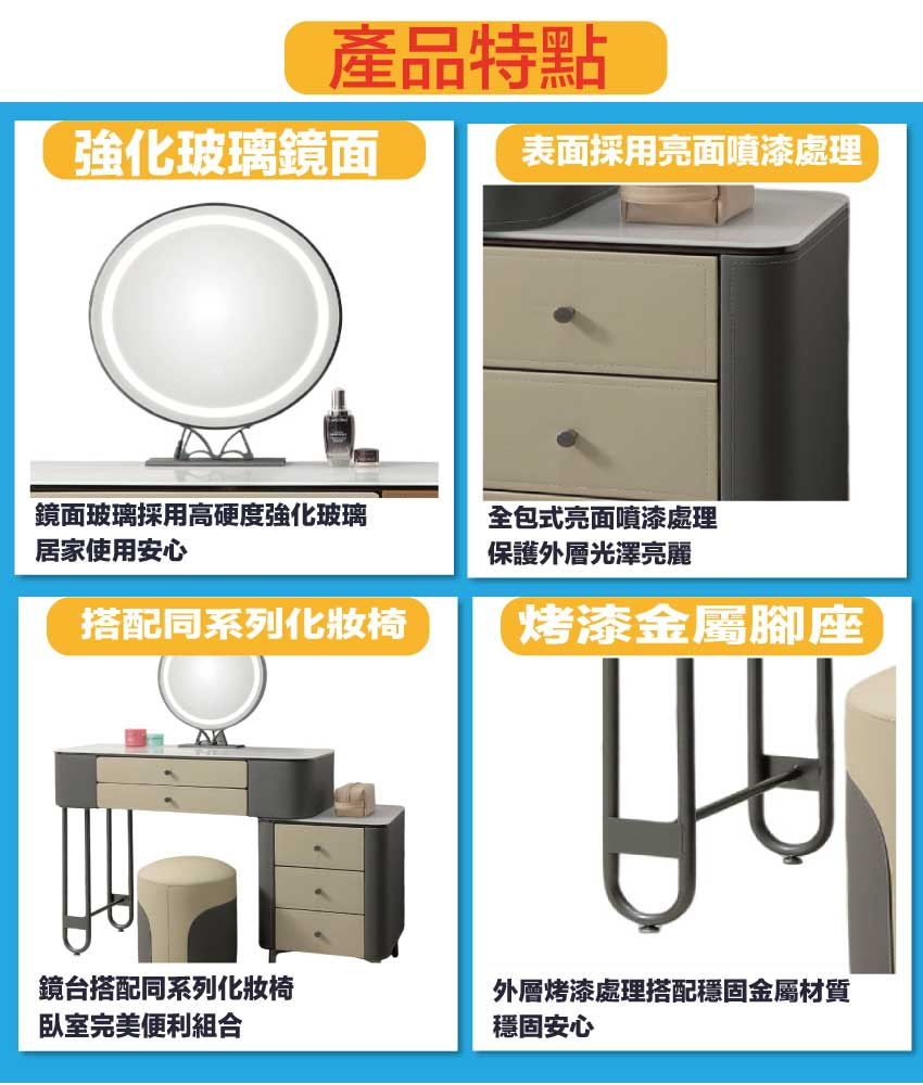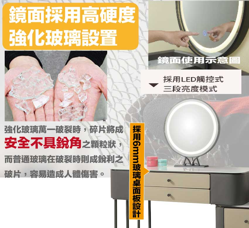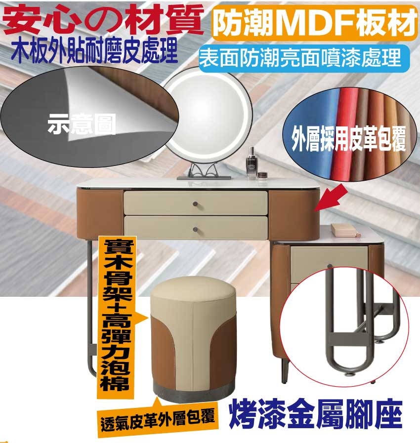 採用防潮MDF板+烤漆金屬腳座+強化玻璃鏡面+透氣柔韌皮革+高回彈泡棉等安心材質製造