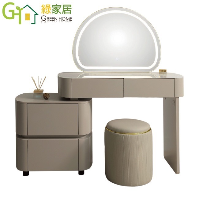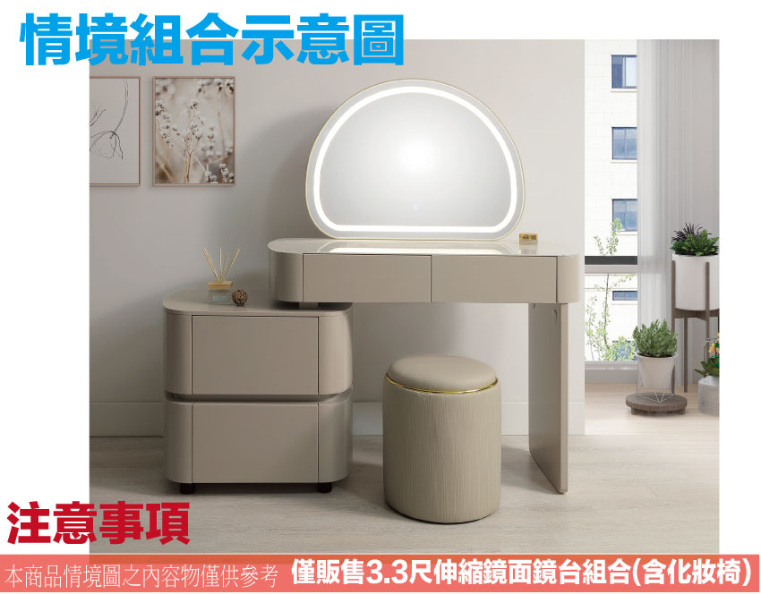 - ◆產品名稱:【綠家居】賈德3.3尺灰色伸縮觸控鏡面鏡台組合(含化妝椅)