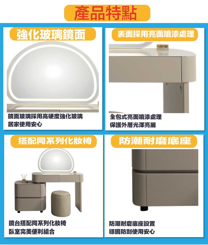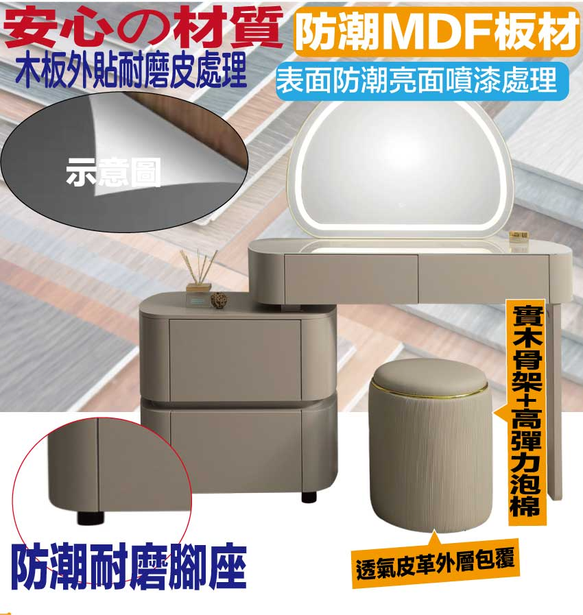 採用防潮MDF板+防潮耐磨腳座+強化玻璃鏡面+透氣柔韌皮革+高回彈泡棉等安心材質製造