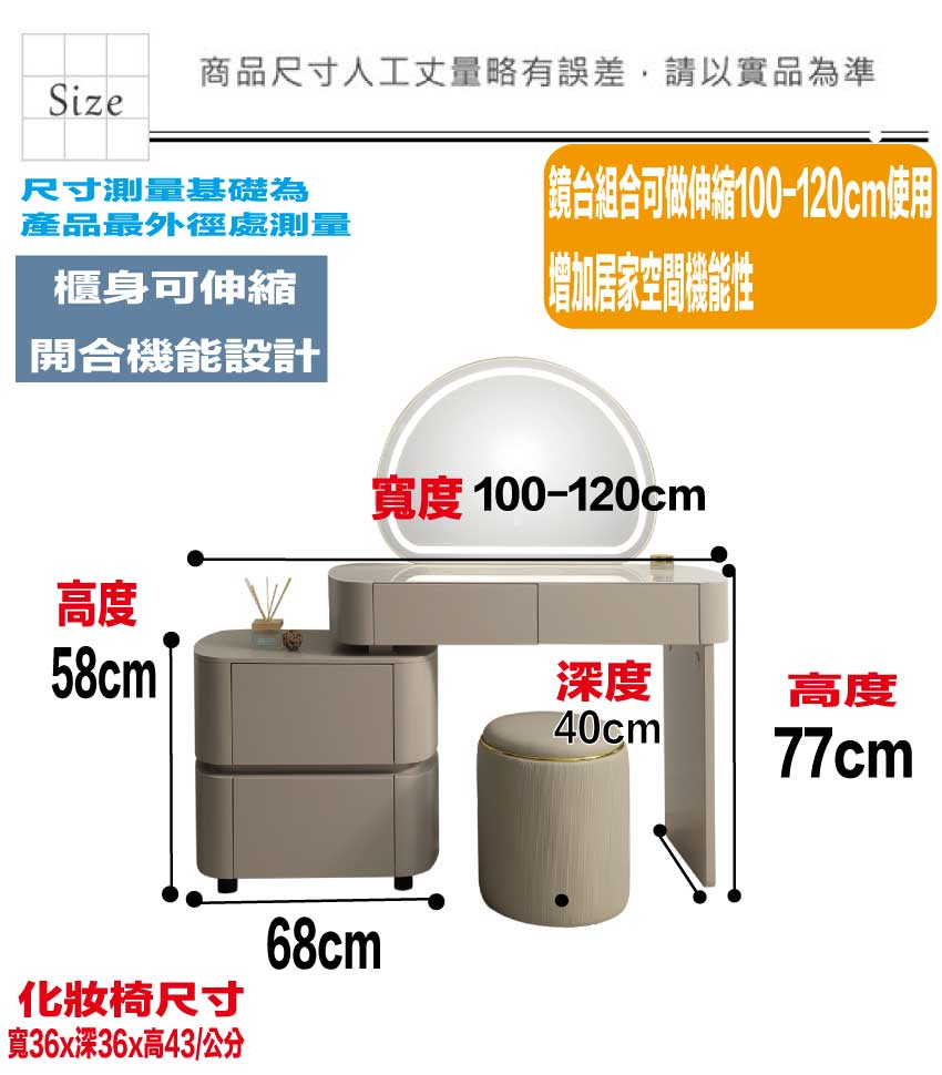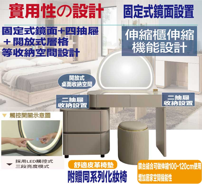 此鏡台組合可伸縮寬度100-120cm變化增加空間靈活性