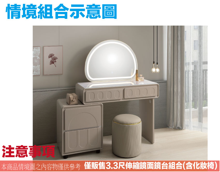 - ◆產品名稱:【綠家居】卡修3.3尺灰色伸縮觸控鏡面鏡台組合(含化妝椅)