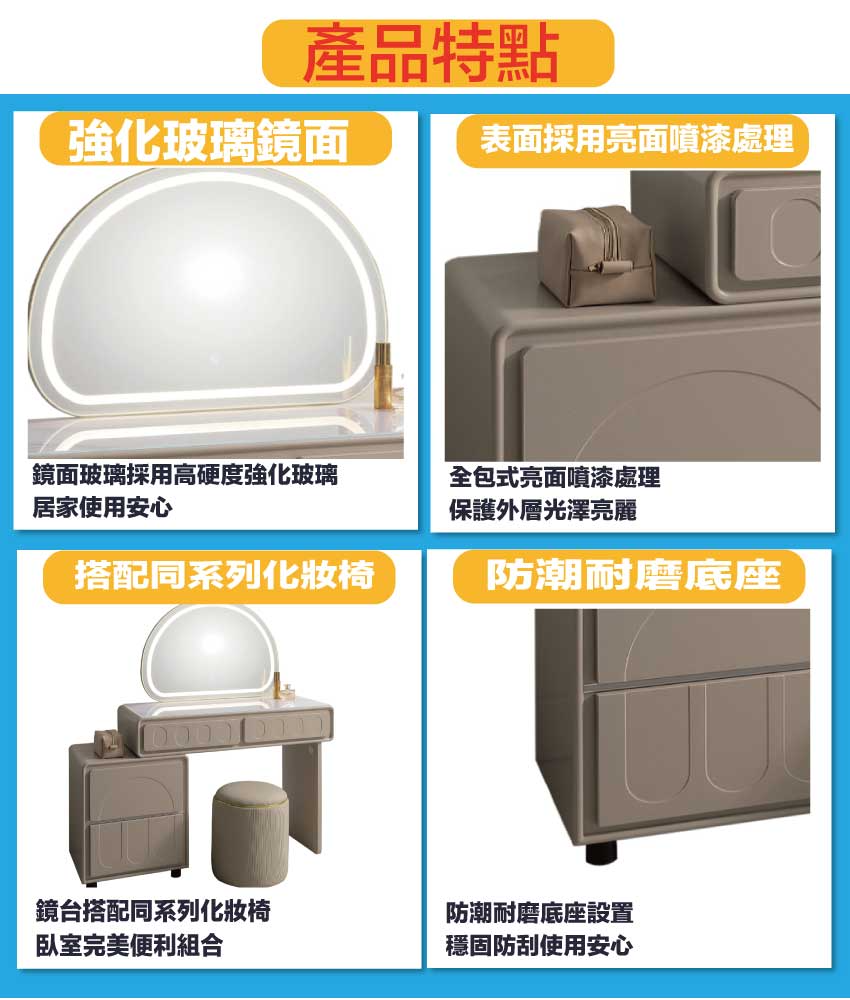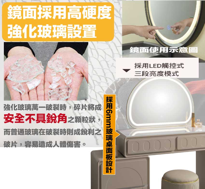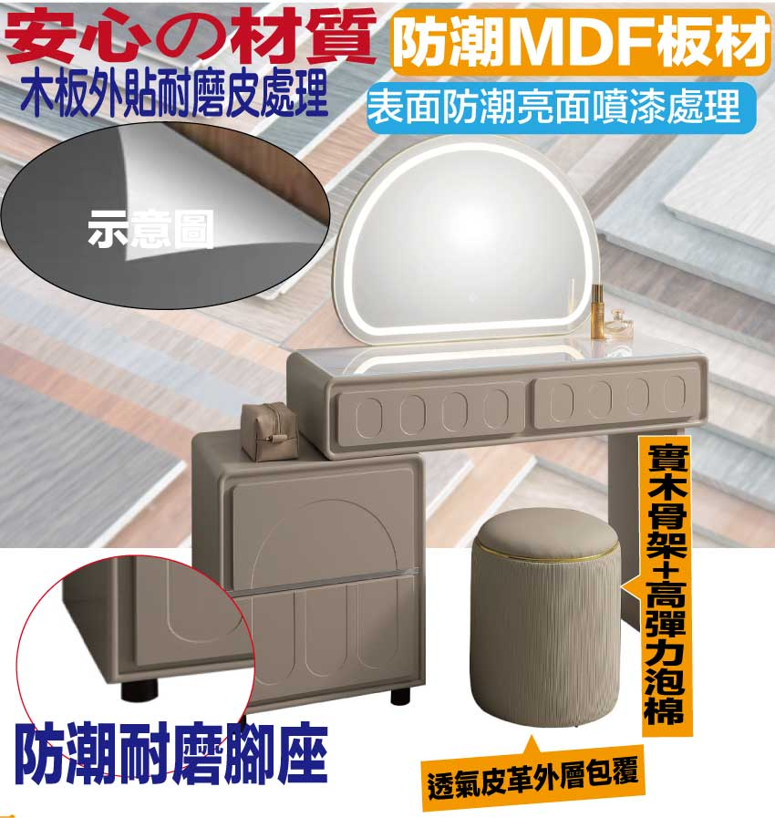 採用防潮MDF板+防潮耐磨腳座+強化玻璃鏡面+透氣柔韌皮革+高回彈泡棉等安心材質製造