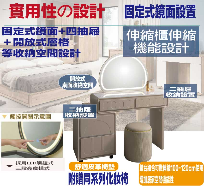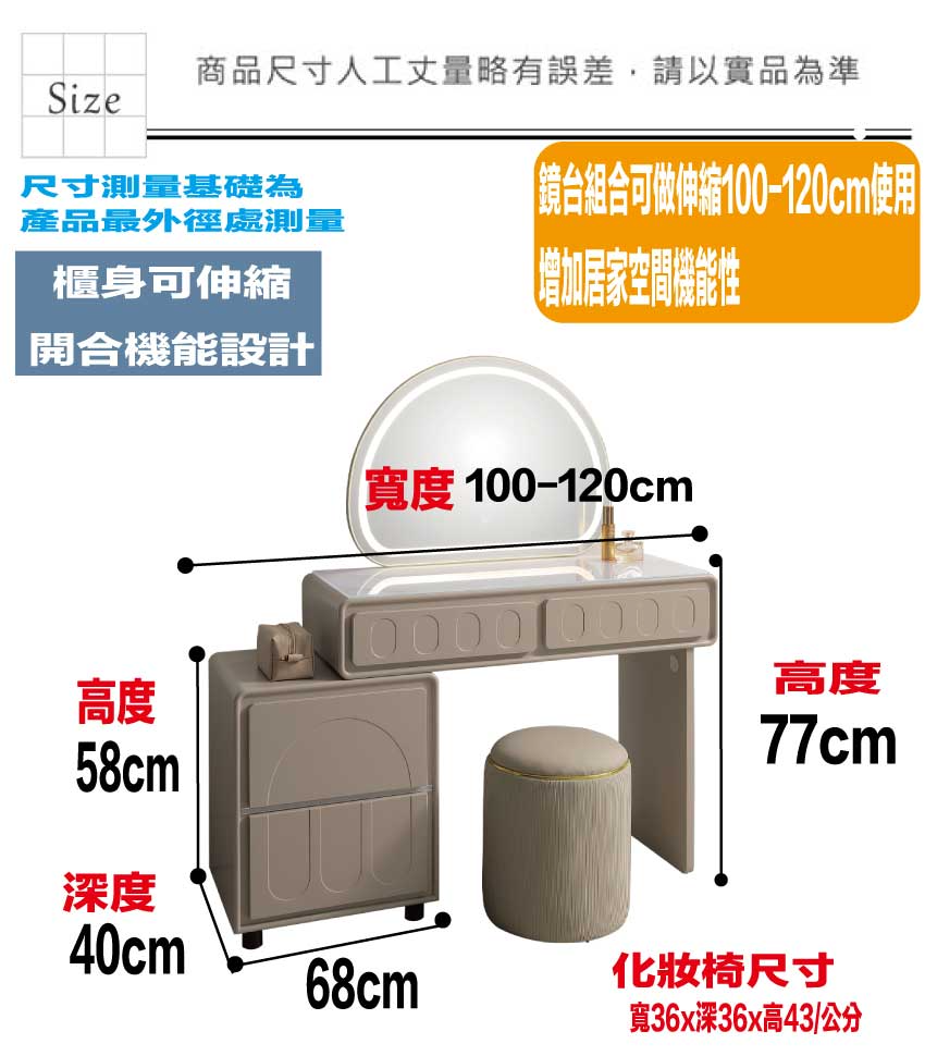 此鏡台組合可伸縮寬度100-120cm變化增加空間靈活性