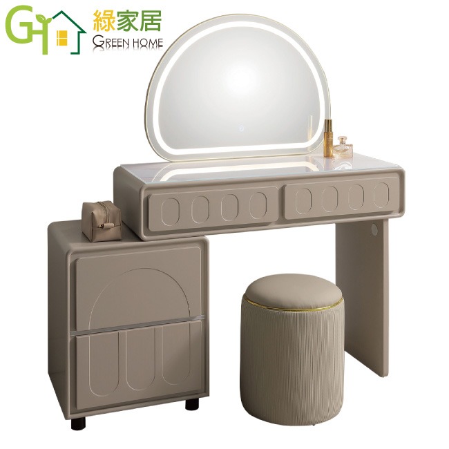 【綠家居】卡修3.3尺灰色伸縮觸控鏡面鏡台組合(含化妝椅) 時尚灰色系+安心材質製造,使用放心+搭配居家更便利,採用防潮MDF板+防潮耐磨腳座+強化玻璃鏡面+透氣柔韌皮革+高回彈泡棉等安心材質製造 ,外層採用防潮亮面噴漆處理搭配採用固定觸控鏡面+四抽屜+內&外開放層格等收納空間設計,全由專人配送到家,專業安心服務,替你省下更多時間!