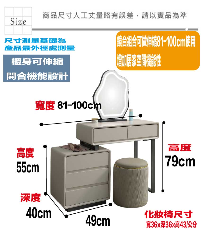 此鏡台組合可伸縮寬度81-100cm變化增加空間靈活性