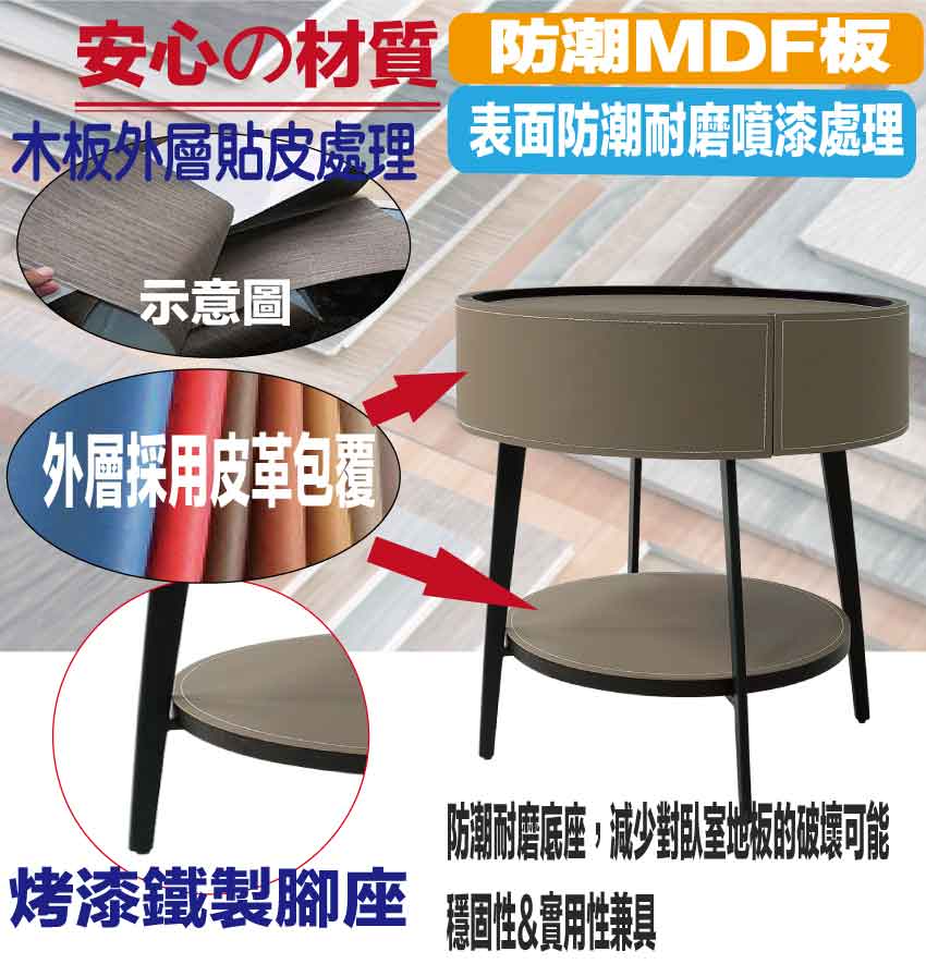 材質:防潮MDF板+烤漆五金腳座+五金滑軌結構+透氣柔韌皮革