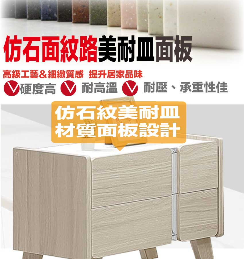 材質:防蛀木心板+防潮耐磨腳座+五金滑軌結構+仿大理石紋美耐皿材質桌面板