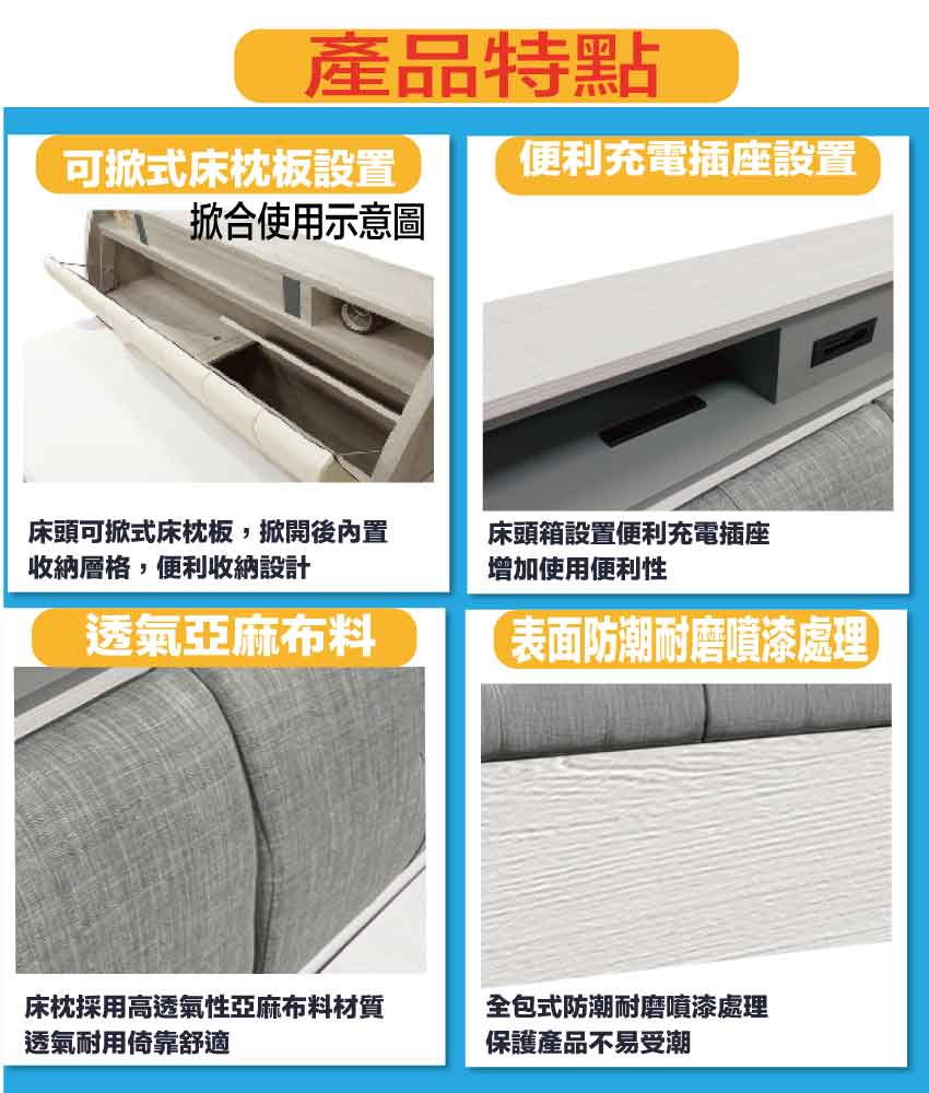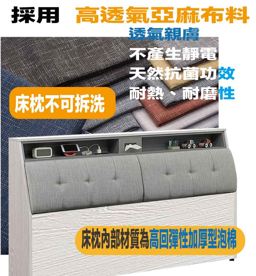 材質:防蛀木心板+六分木床板+防潮耐磨底座+透氣亞麻布+高回彈泡棉