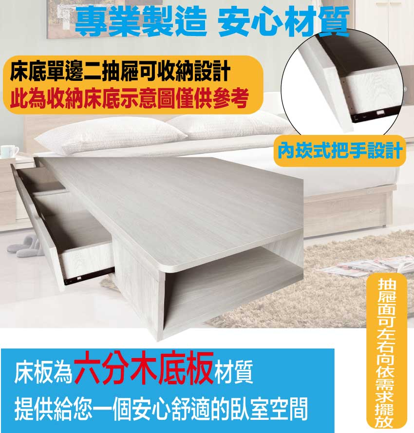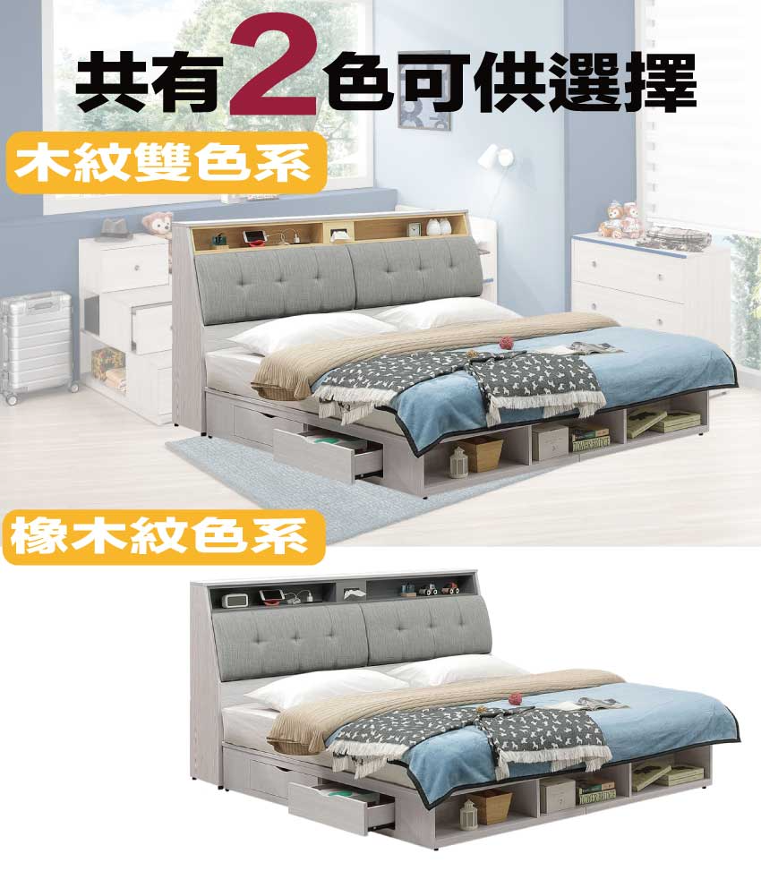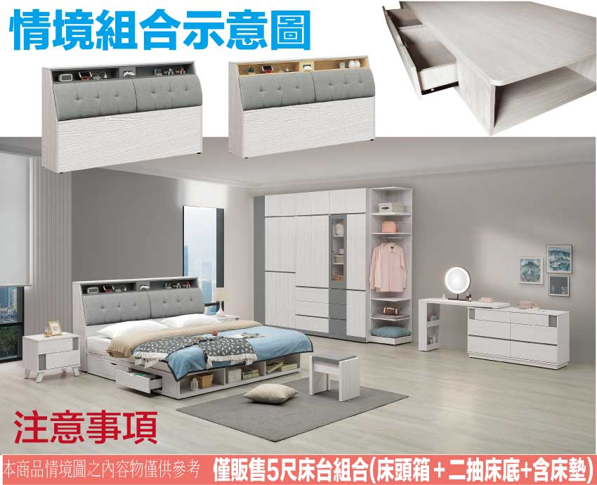 搭配床頭可掀式床枕板+內&外開放收納層格+便利插座設置+床底座單邊開合二抽屜等收納空間設計