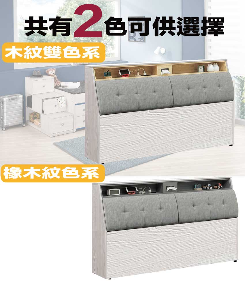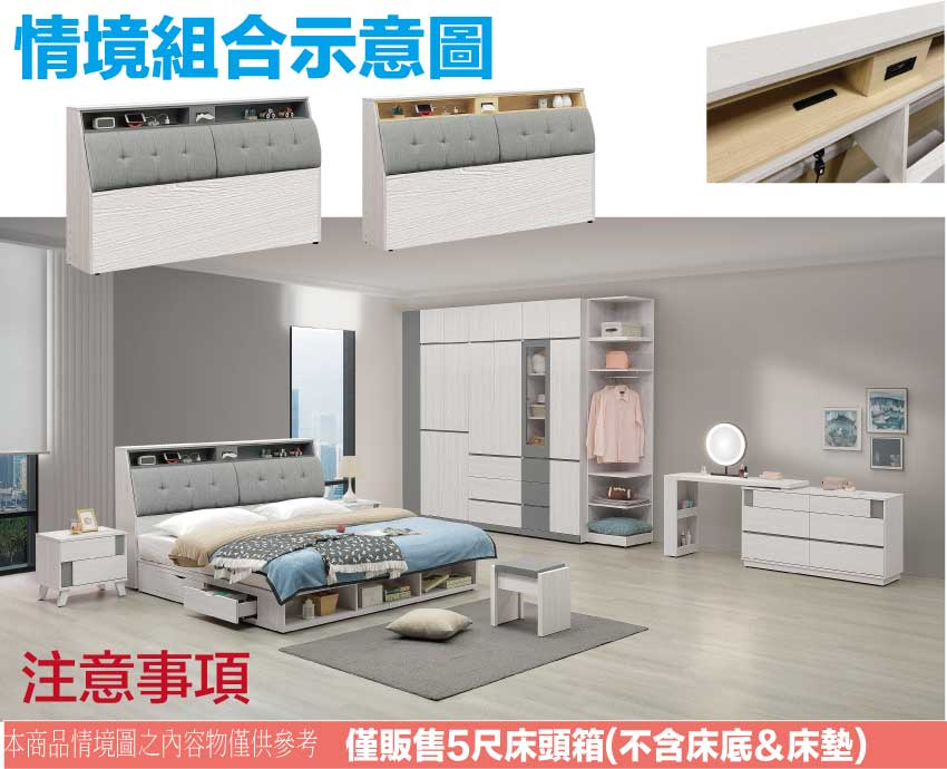 搭配床頭可掀式床枕板+內&外開放收納層格+便利插座設置等收納空間設計