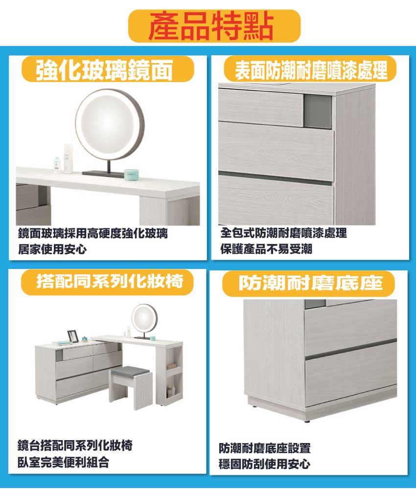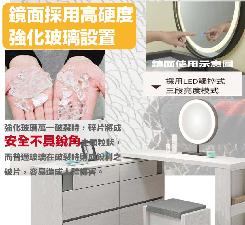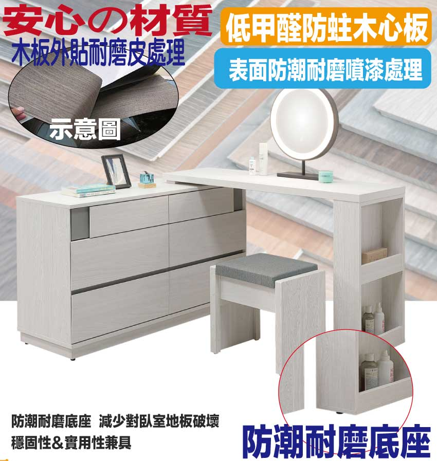 採用防蛀木心板+防潮耐磨底座+五金滑軌結構+強化玻璃鏡面等安心材質製造