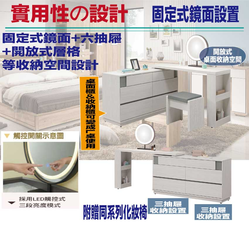 搭配採用觸控鏡面+六抽屜+開放桌面等收納空間設計
