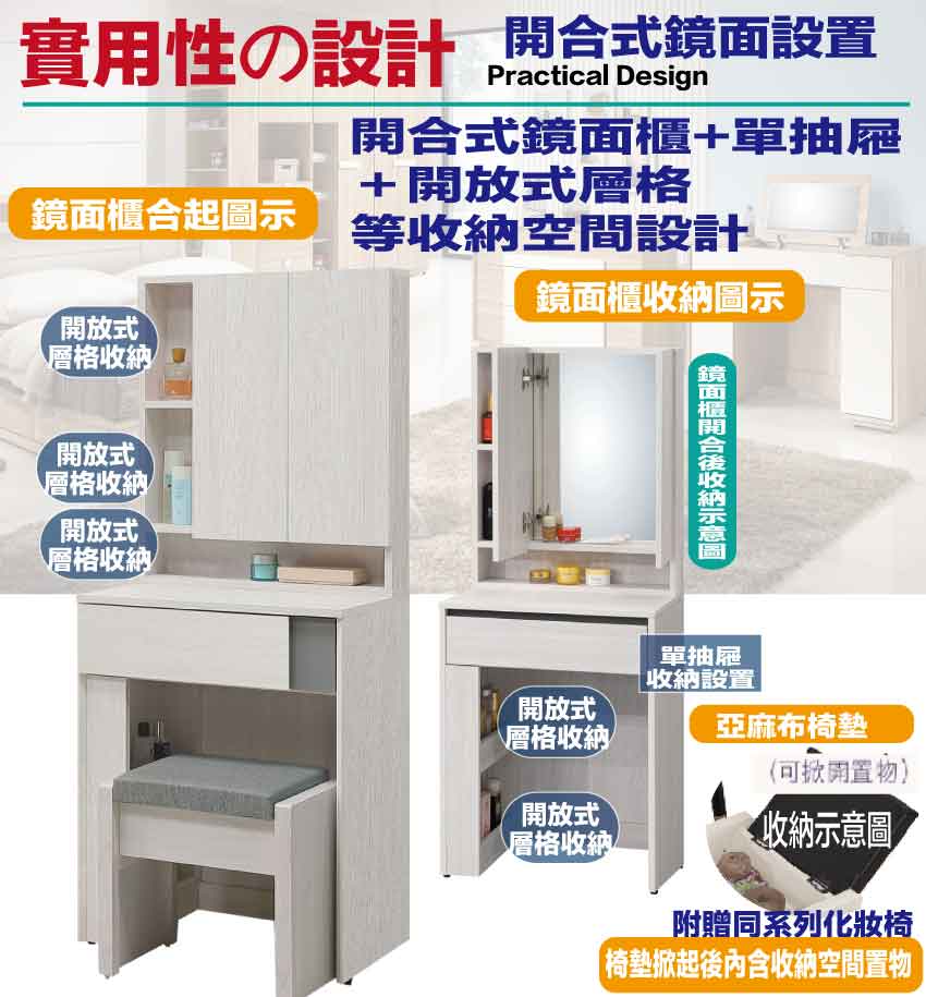 鏡台搭附可收納椅凳採用坐墊可上掀後內置收納空間的便利性設計