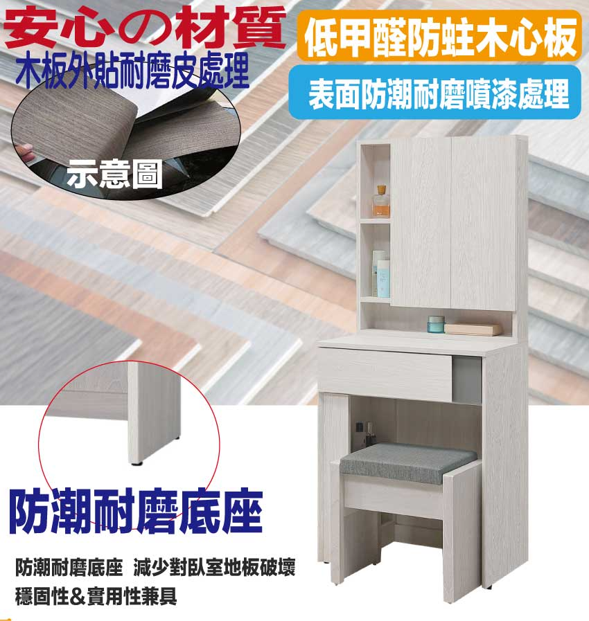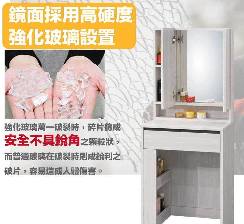 採用防蛀木心板+防潮耐磨底座+五金滑軌結構+強化玻璃鏡面等安心材質製造
