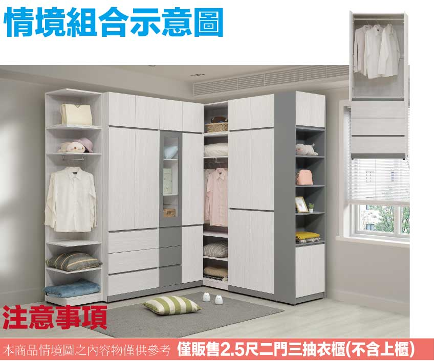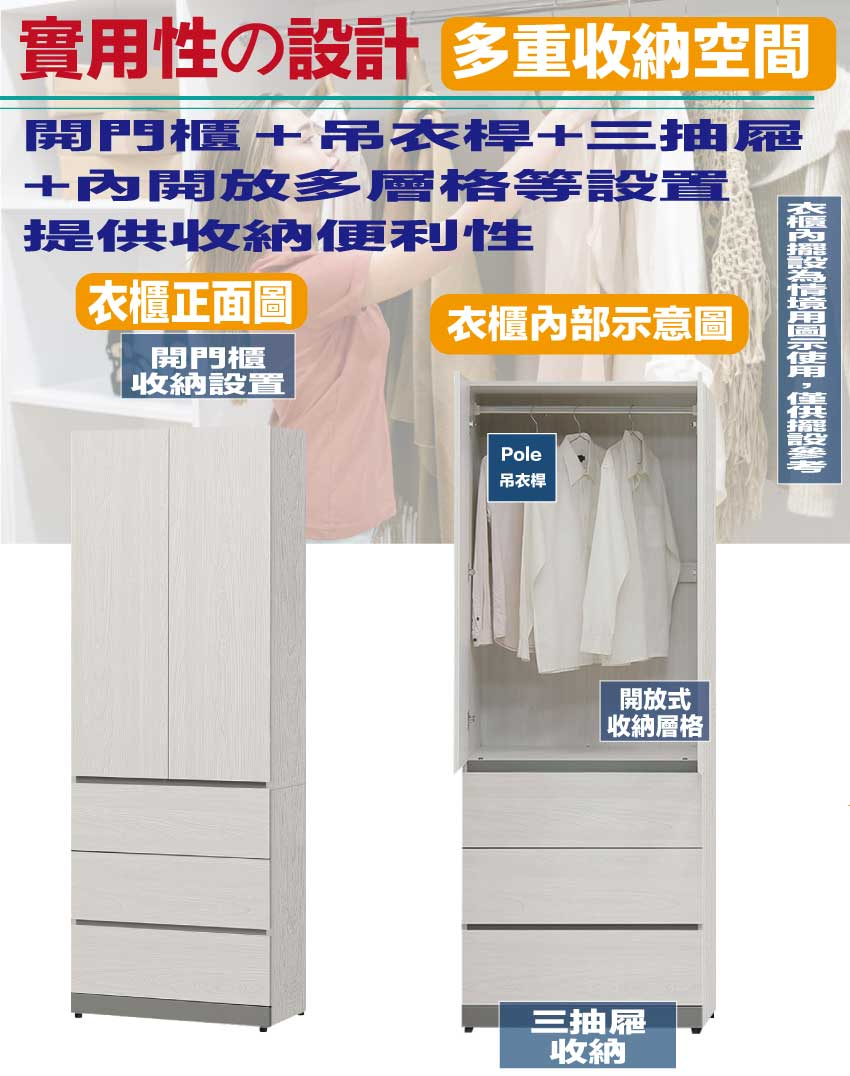 搭配採用開門櫃+吊衣桿+三抽屜+內開放多層格等收納空間設計