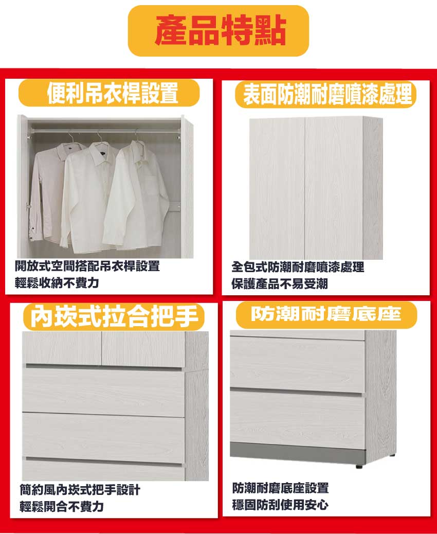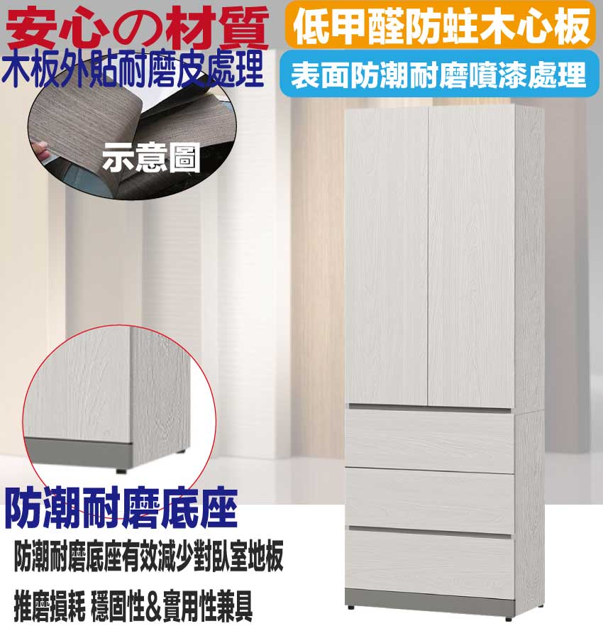 材質:防蛀木心板+防潮耐磨腳座+防夾手緩衝門片五金+五金滑軌結構