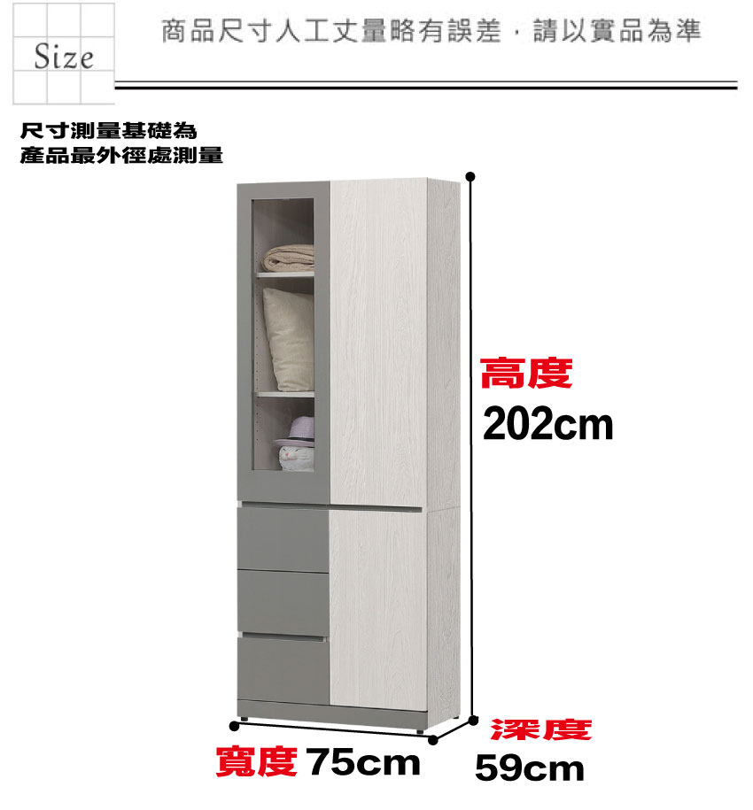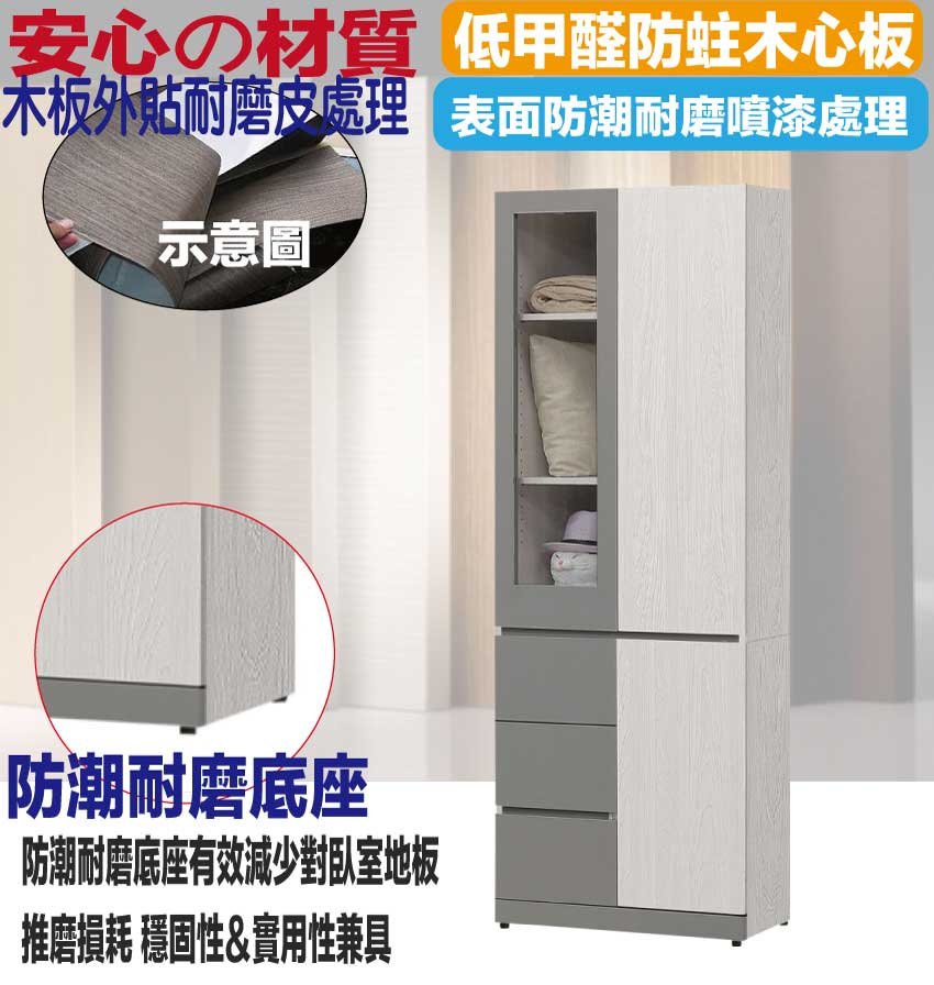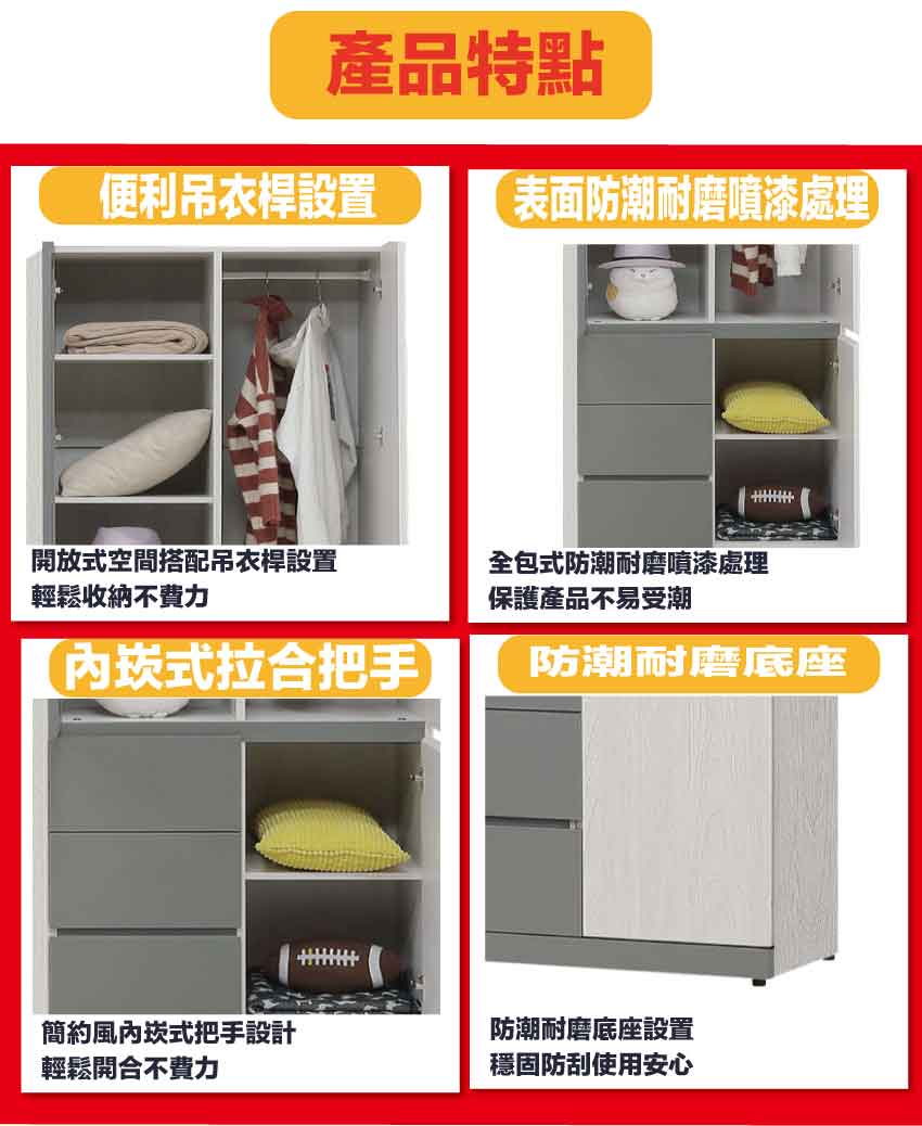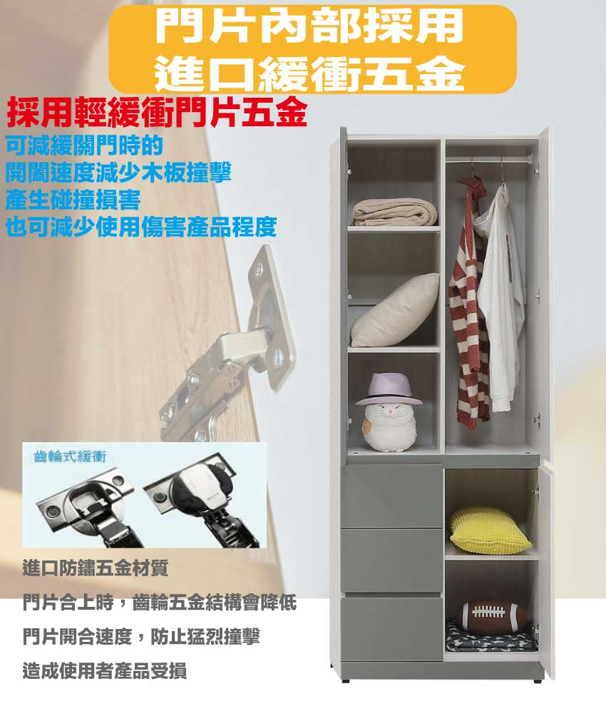 材質:防蛀木心板+防潮耐磨腳座+防夾手緩衝門片五金+五金滑軌結構