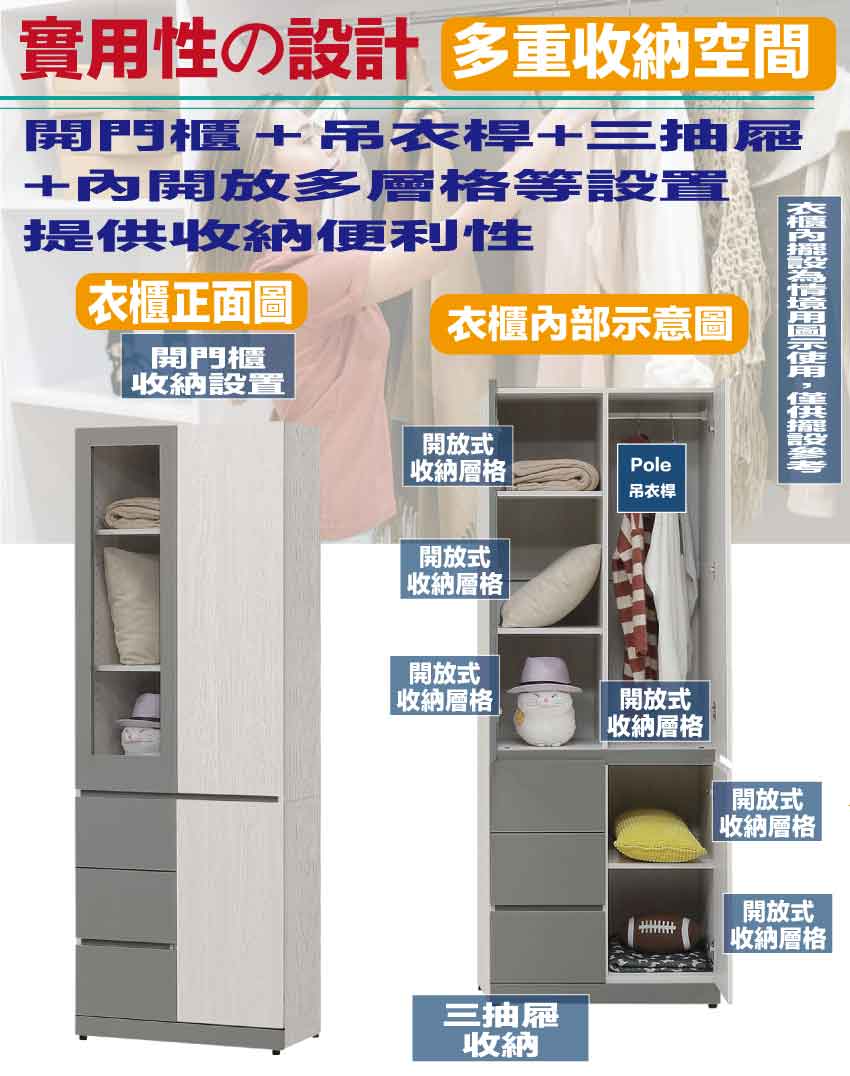 搭配採用開門櫃+吊衣桿+三抽屜+內開放多層格等收納空間設計