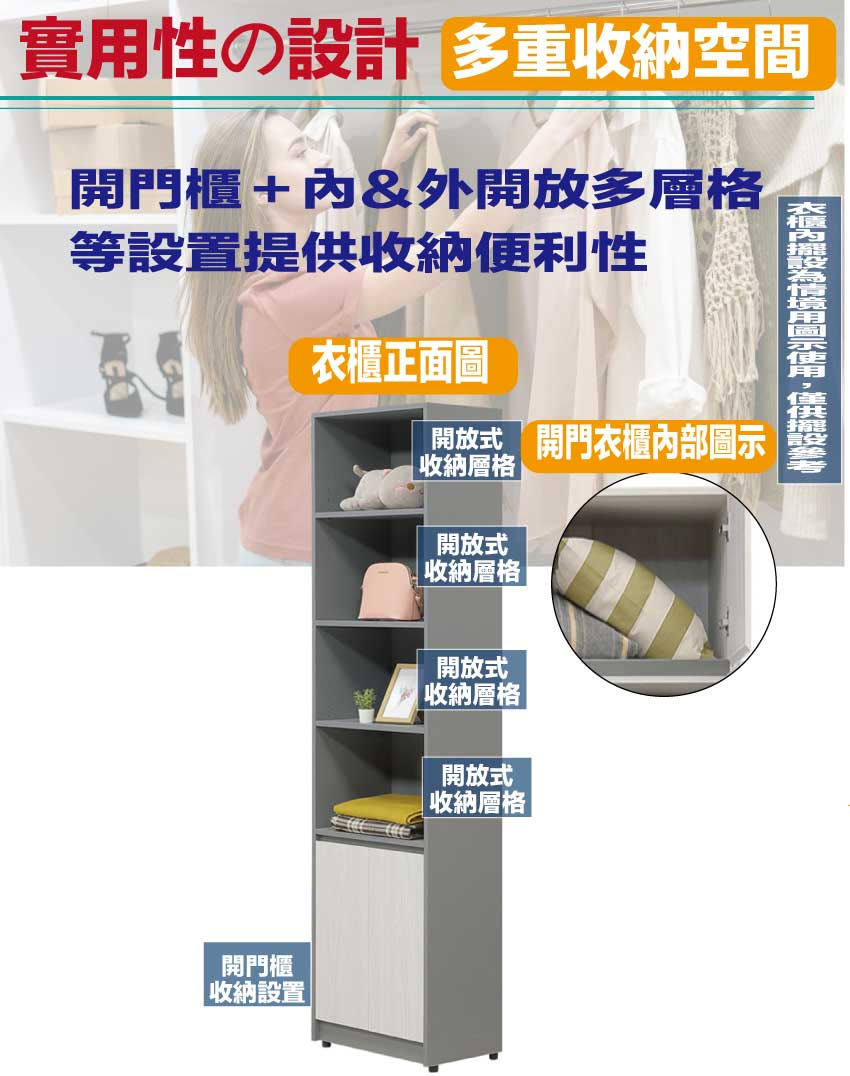 搭配採用開門櫃+內&外開放多層格等收納空間設計