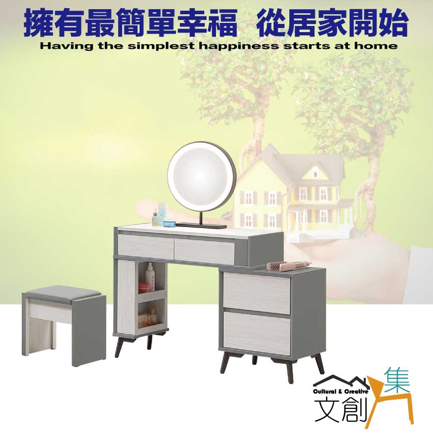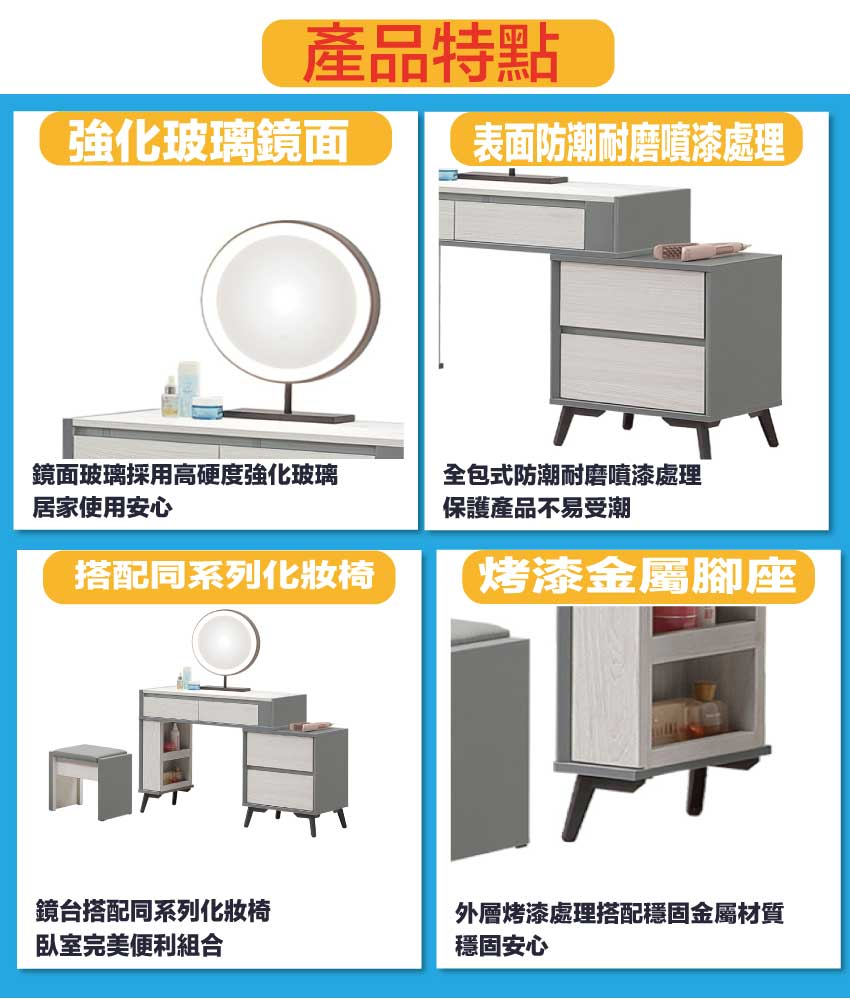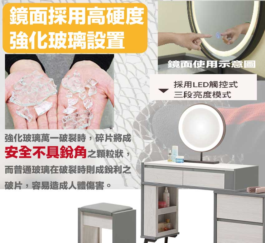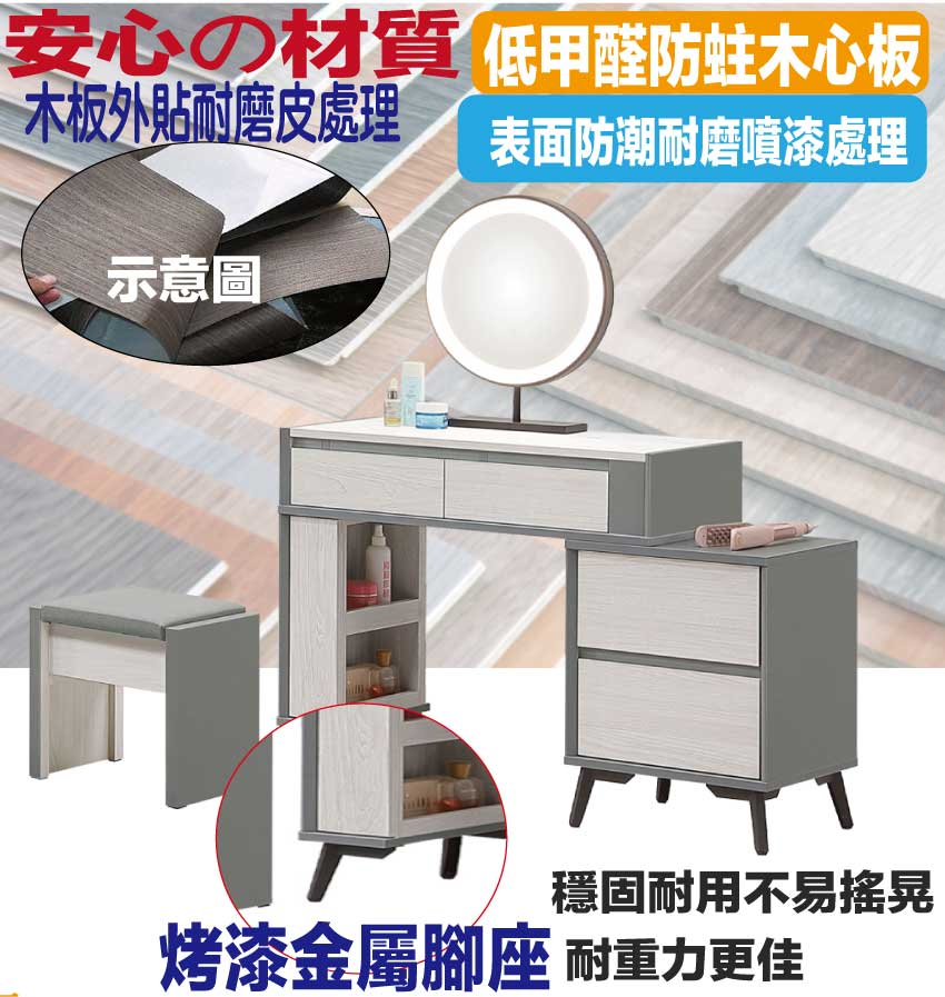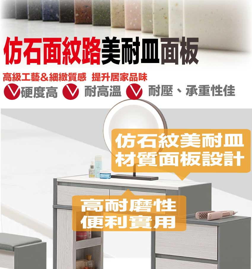 採用防蛀木心板+烤漆五金腳座+五金滑軌結構+仿大理石紋美耐皿材質桌面板+強化玻璃鏡面等安心材質製造