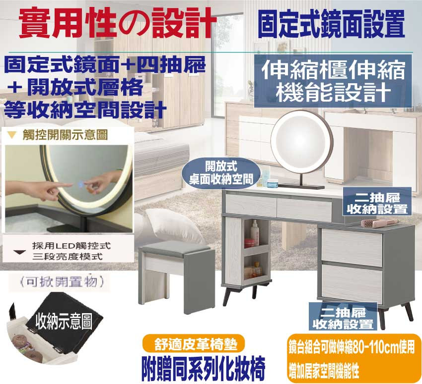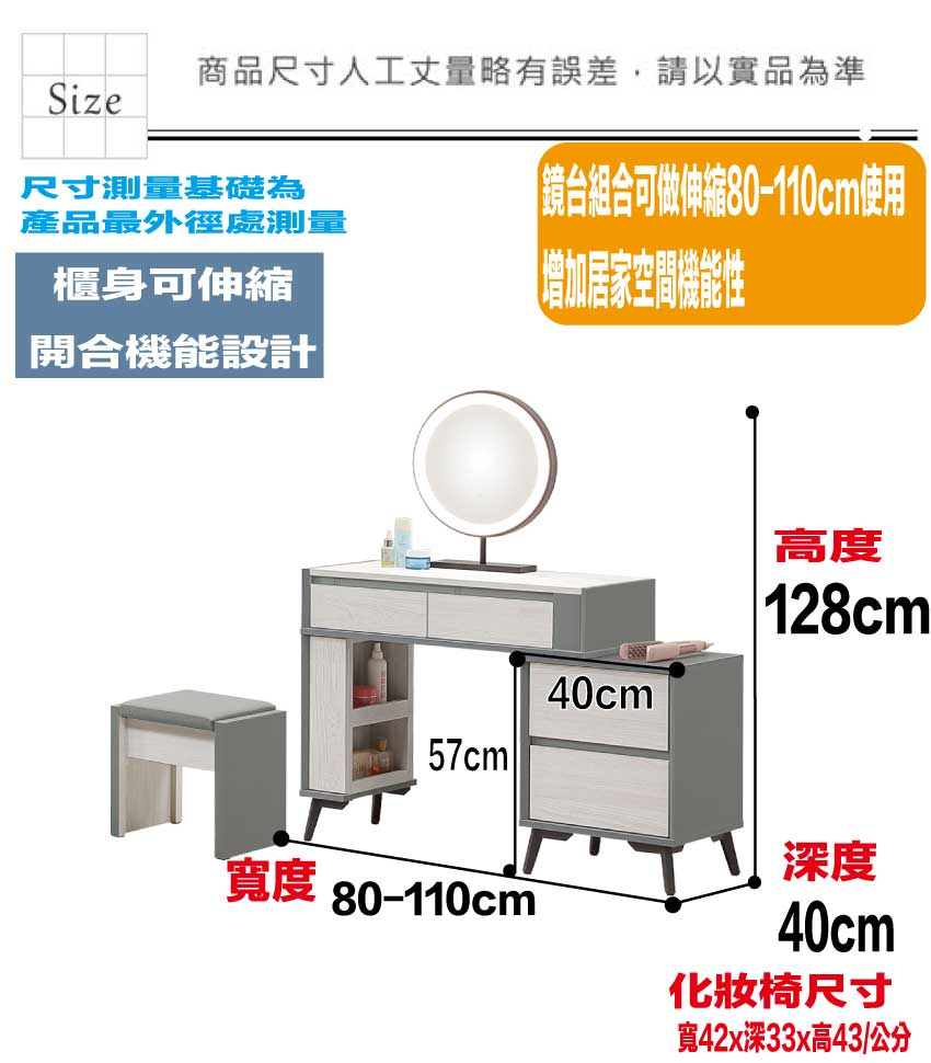 鏡臺採用櫃身可伸縮80-110cm使用讓您可依空間大小調整的便利性設計