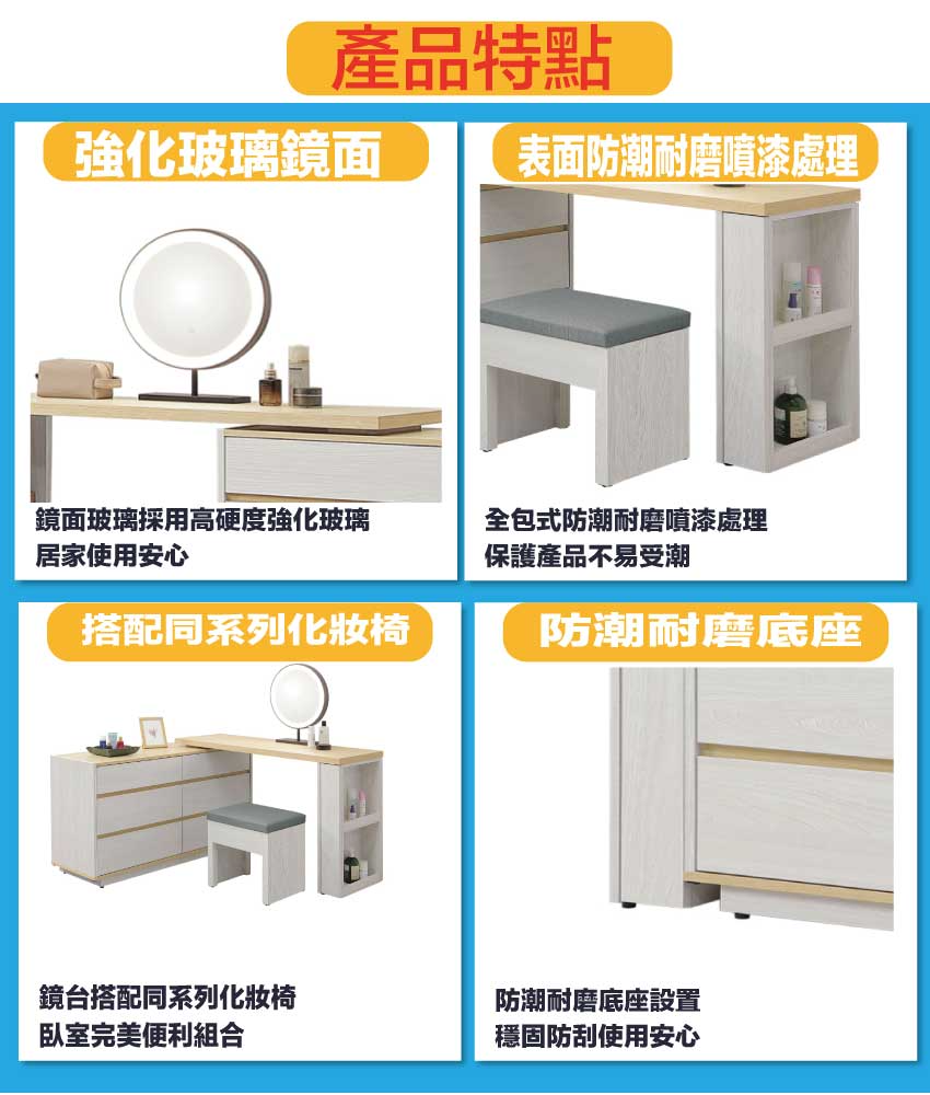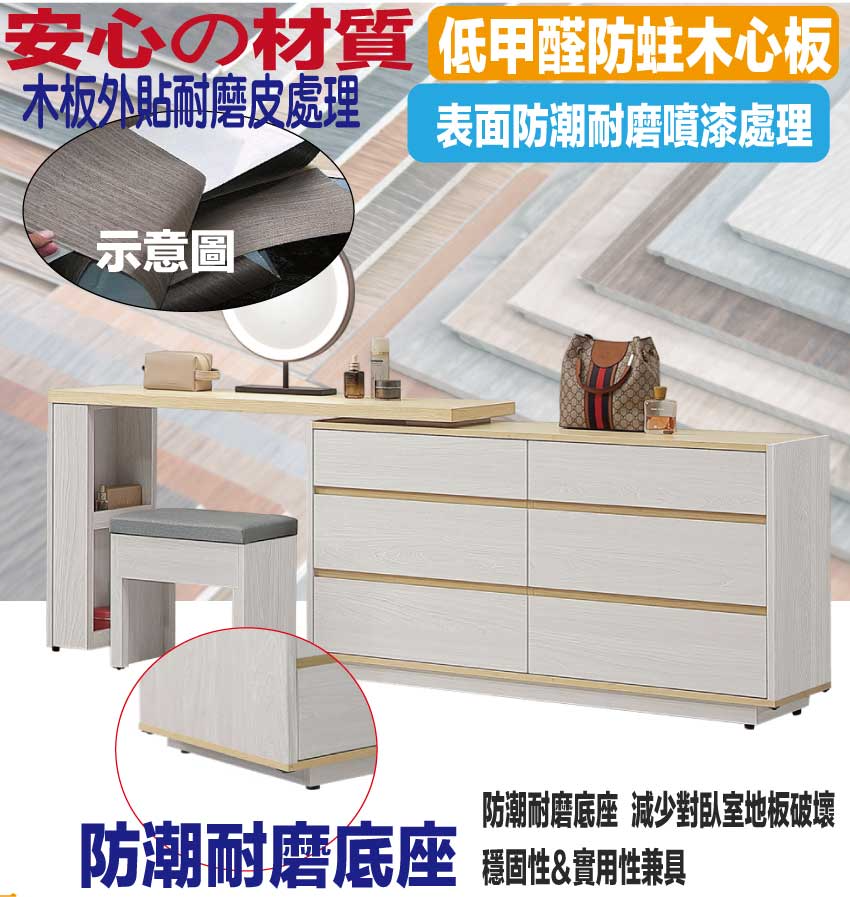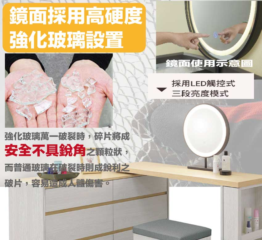 採用防蛀木心板+防潮耐磨底座+五金滑軌結構+強化玻璃鏡面等安心材質製造