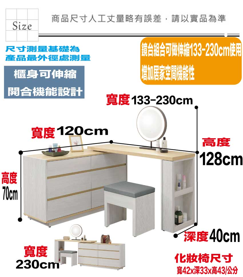 尺寸:(寬)133-230x(深)40x(高)128/公分