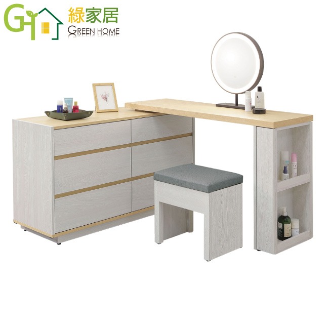 【綠家居】弗格4.4尺伸縮觸控鏡面鏡台組合(含化妝椅) 木紋雙色系+安心材質製造,使用放心+搭配居家更便利,採用防蛀木心板+防潮耐磨底座+五金滑軌結構+強化玻璃鏡面等安心材質製造 ,外層採用防潮耐磨噴漆處理搭配採用觸控鏡面+六抽屜+開放桌面等收納空間設計,全由專人配送到家,專業安心服務,替你省下更多時間!