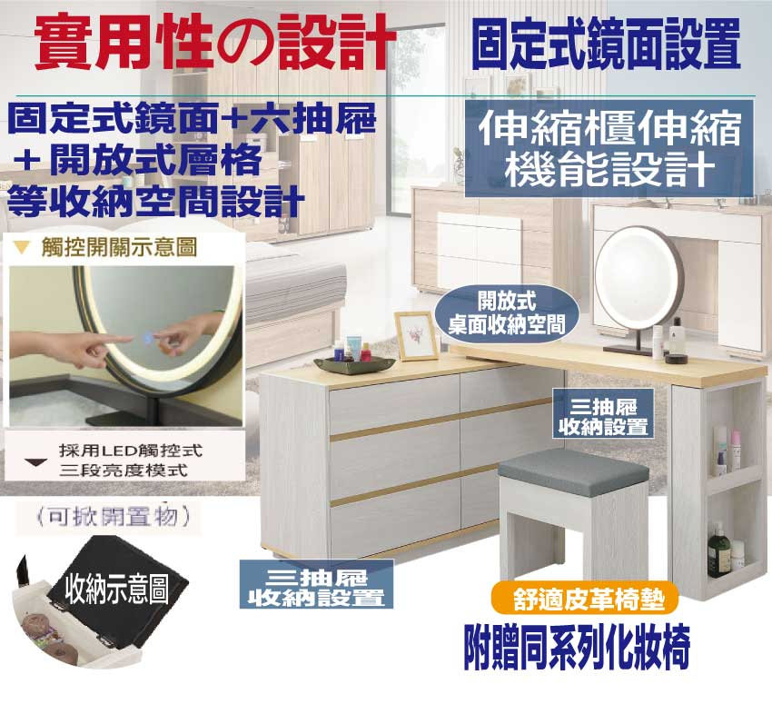 鏡臺採用櫃身可伸縮135-230cm使用加上可變化L型桌櫃組合的便利性設計
