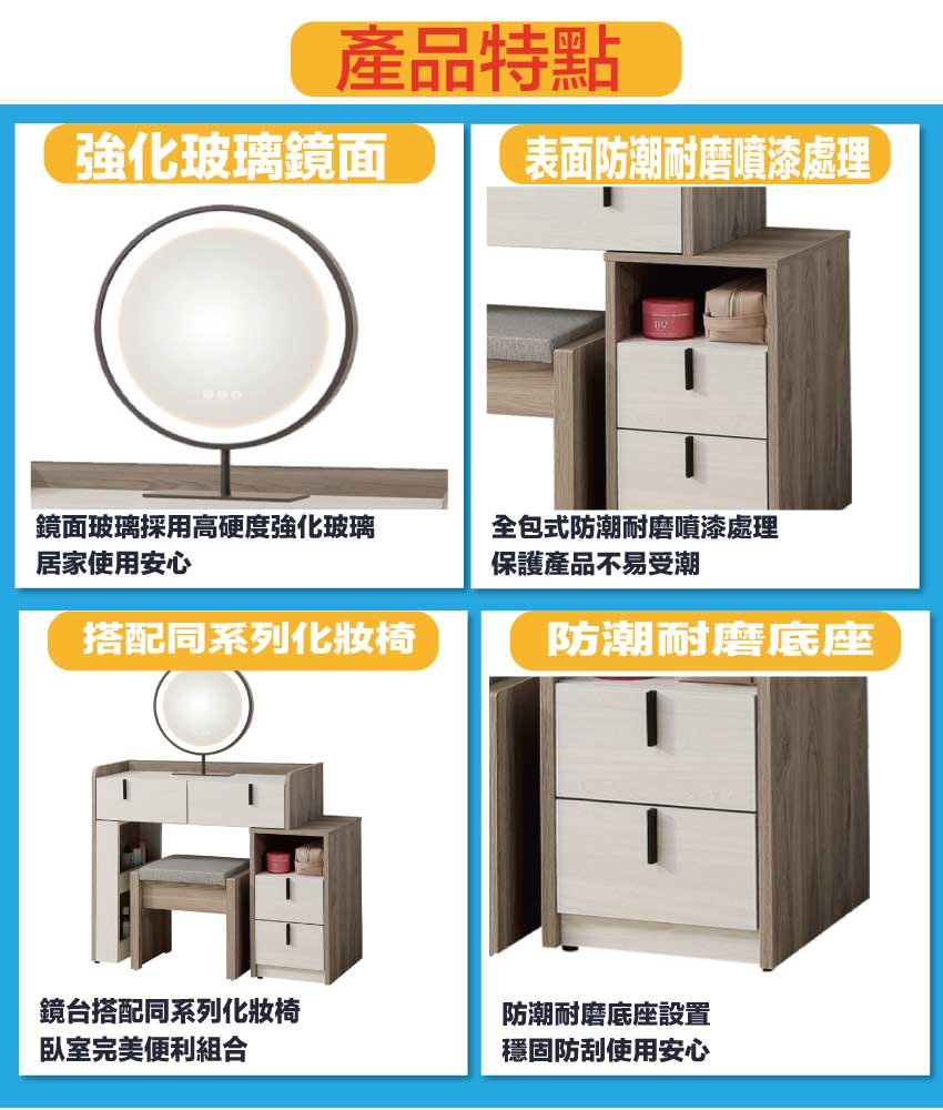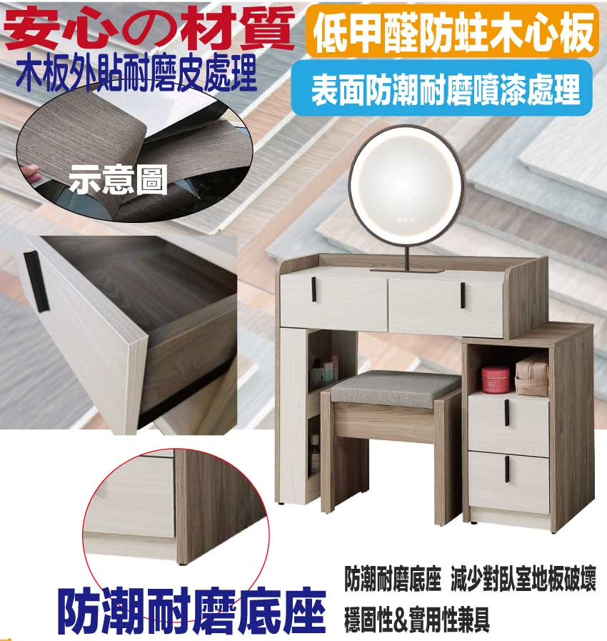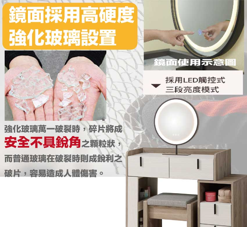 採用防蛀木心板+防潮耐磨腳座+五金滑軌結構+強化玻璃鏡面等安心材質製造