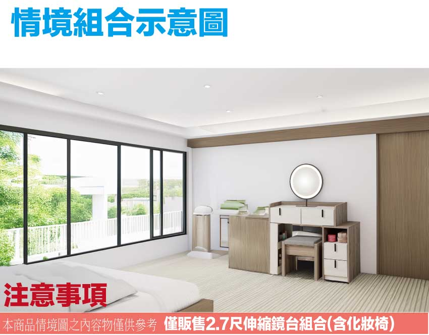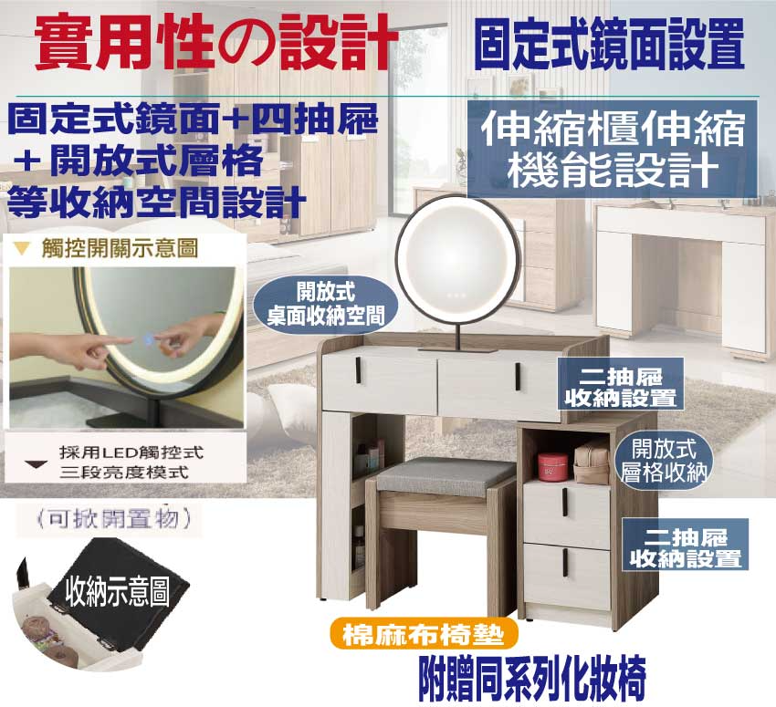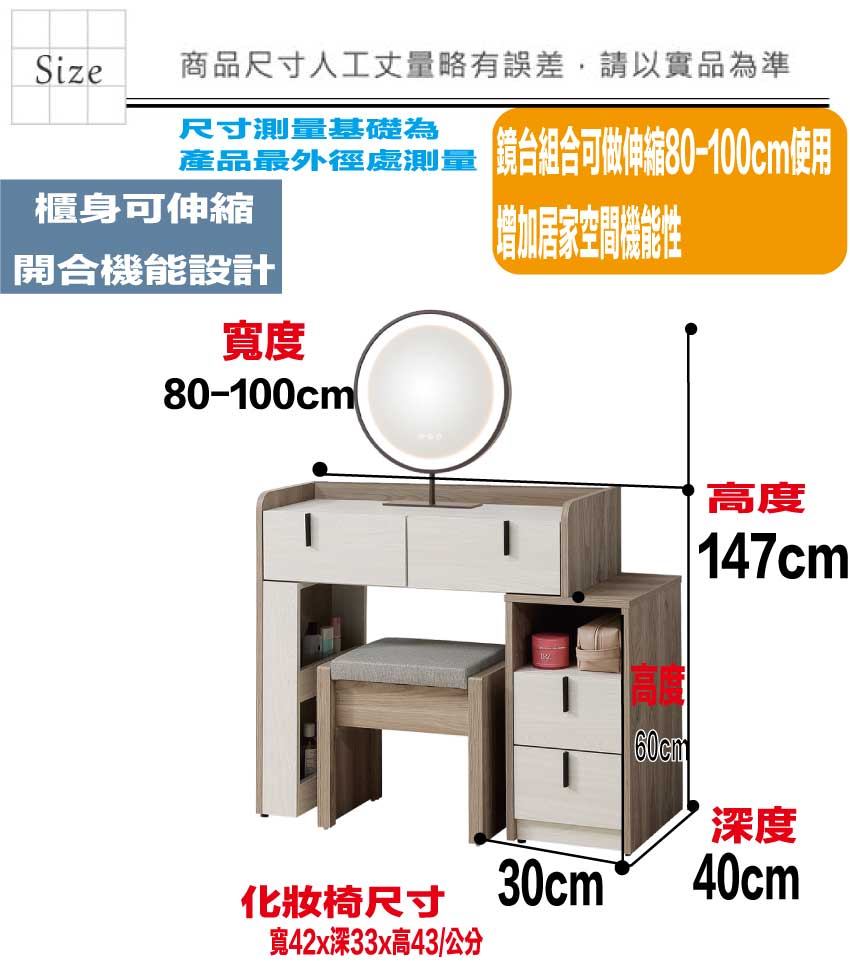鏡臺採用櫃身可伸縮80-100cm使用讓您可依空間大小調整的便利性設計