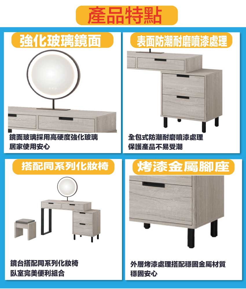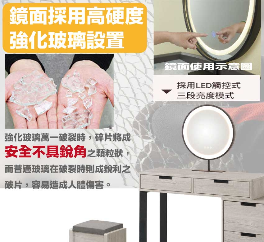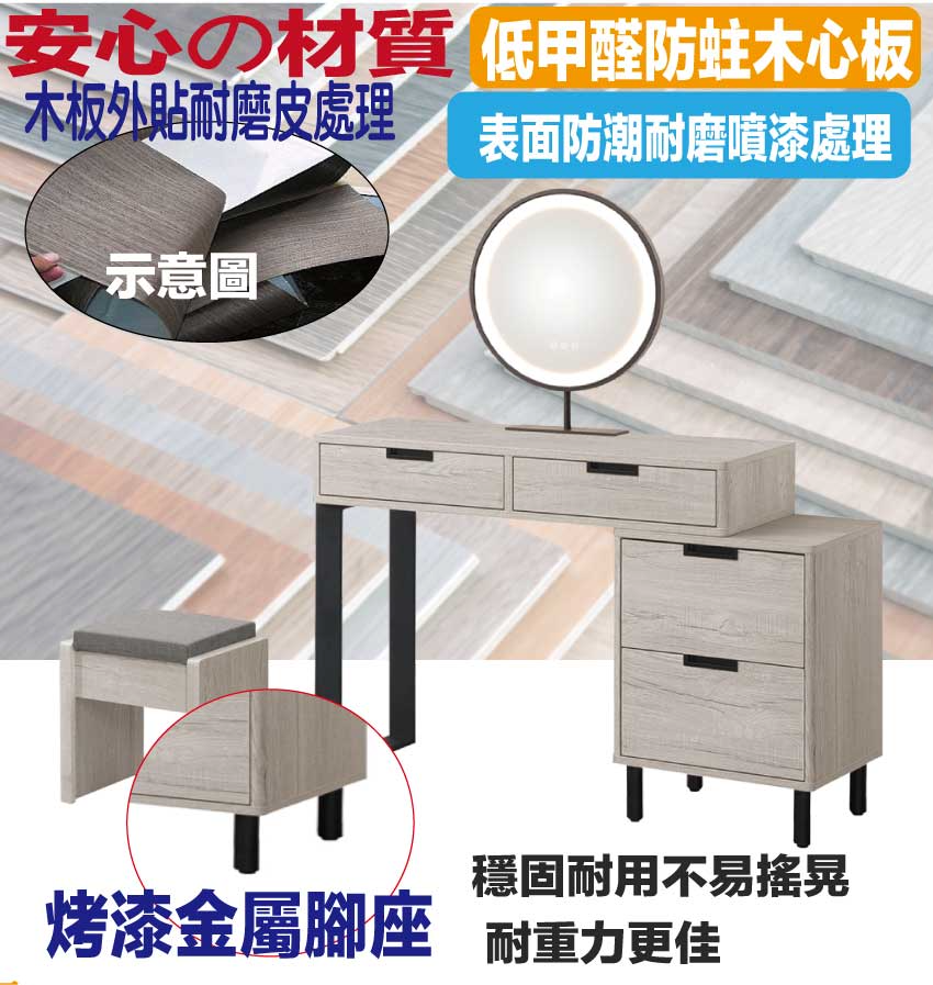 採用防蛀木心板+烤漆五金腳座+五金滑軌結構+仿大理石紋美耐皿材質桌面板+強化玻璃鏡面等安心材質製造