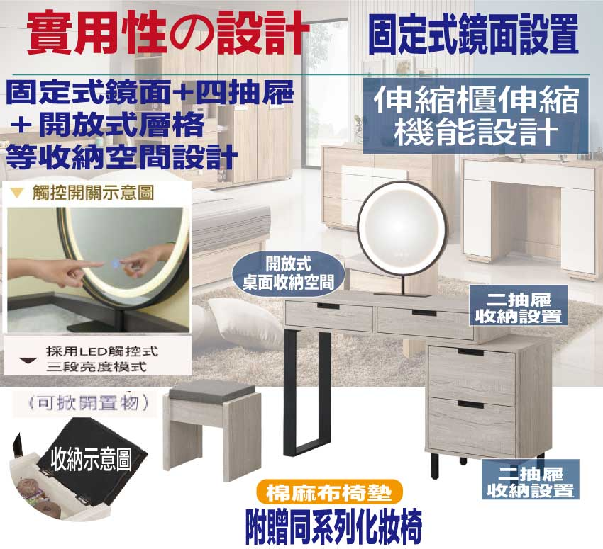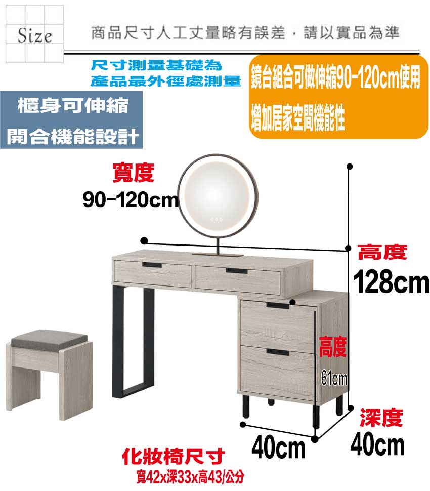 鏡臺採用櫃身可伸縮80-110cm使用讓您可依空間大小調整的便利性設計
