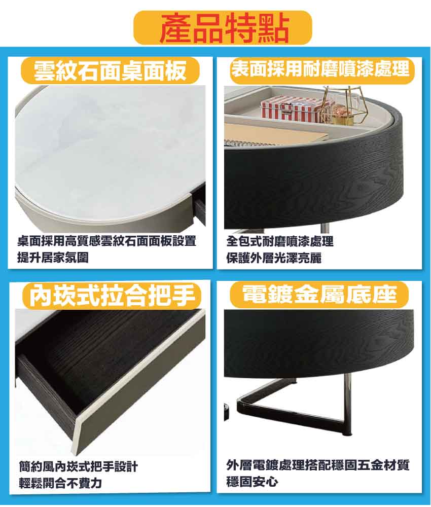 材質:防潮MDF板+不鏽鋼腳座+五金滑軌結構+12mm雲紋石面桌面板
