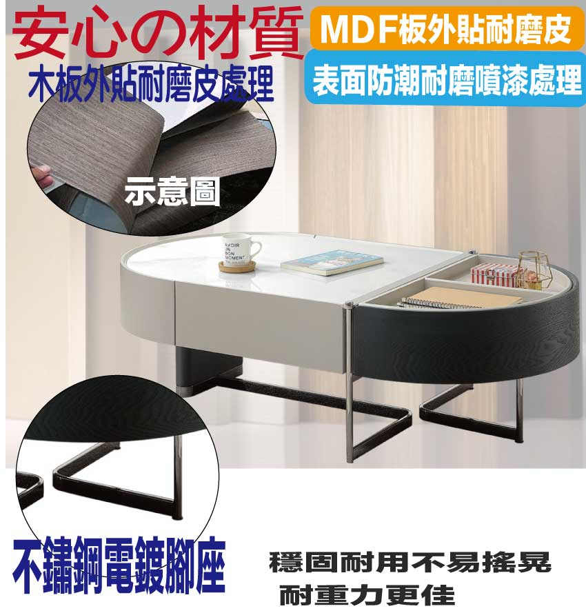 採用防潮MDF板+不鏽鋼腳座+五金滑軌結構+12mm雲紋石面桌面板等安心材質製造