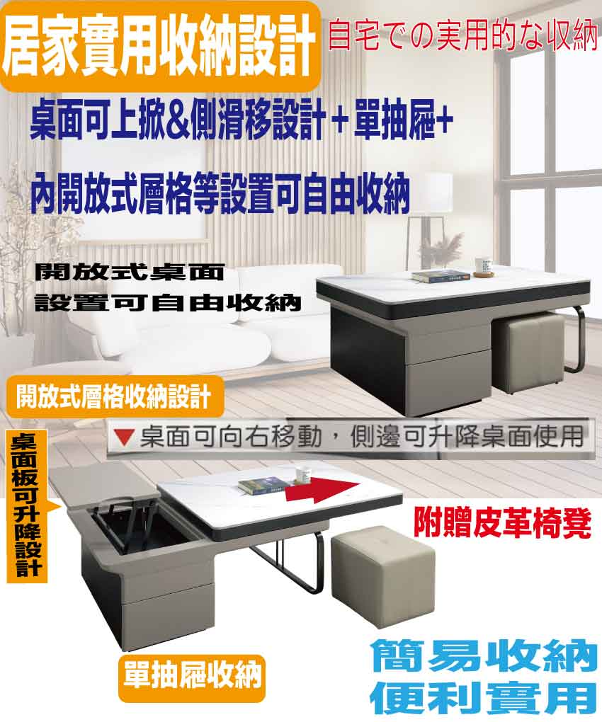 搭配採用可升降桌面板(46-62cm)抽屜+桌面板可橫移伸縮使用+單抽屜+開放層格+附贈單個皮革圓凳等收納空間設計