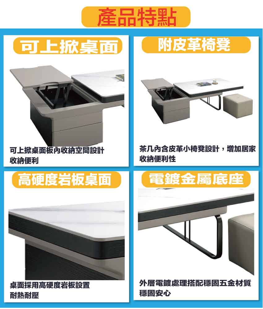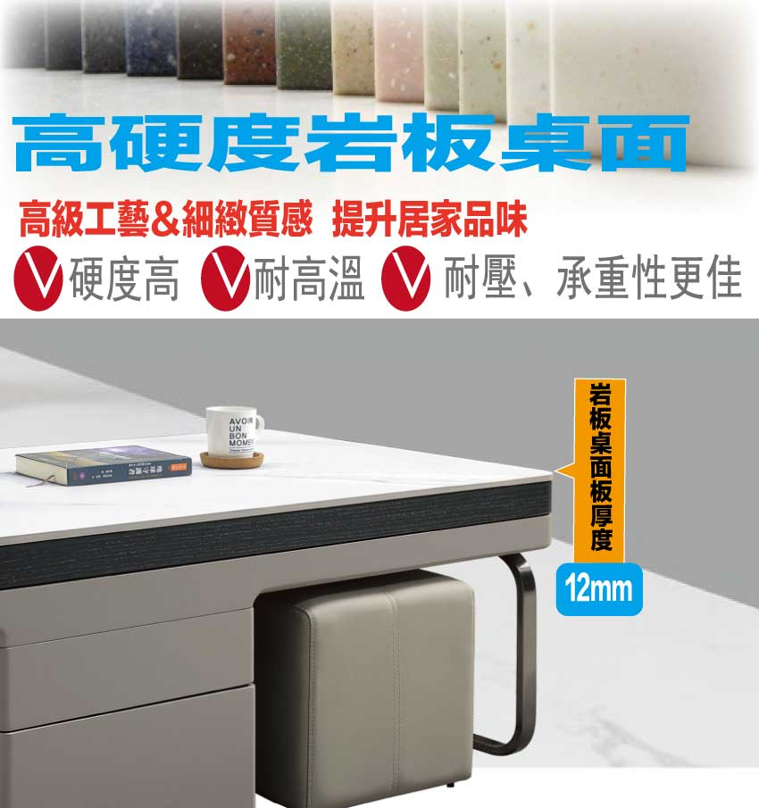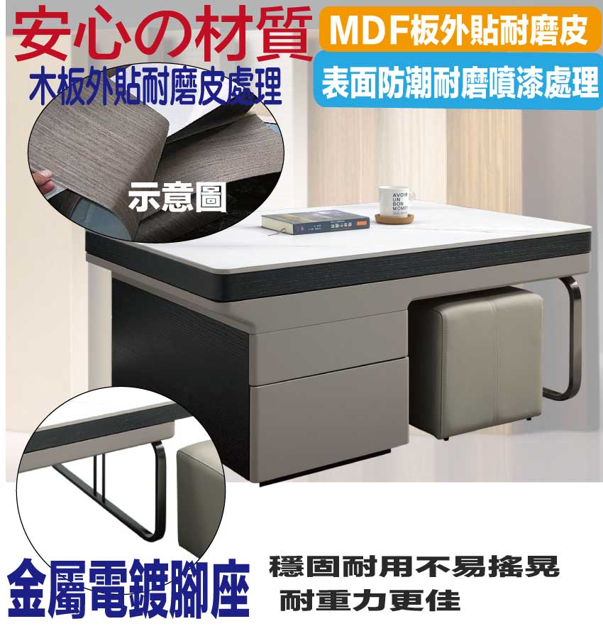 採用防潮MDF板+金屬電鍍腳座+五金滑軌結構+升降五金結構+12mm雲紋石面桌面板等安心材質製造